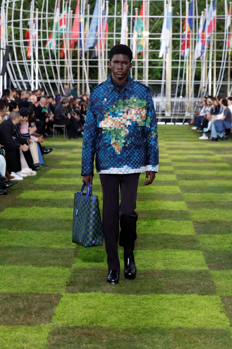 路易威登Louis Vuitton 2025春夏男裝大秀於聯合國教科文組織之家(La Maison de l'UNESCO)的屋頂上舉行,創意總監Pharrell Williams從音樂領域到時尚設計,似乎漸入佳境,整體更有組織性、風格也更加鮮明。本季以地球為主題,以宏觀的視角描繪人類與世界,世界地圖、衛星雲圖直接成為服裝圖案,象徵海洋的藍色與象徵大地的綠色則成為 Damier 格紋配色,經典 Damier 格紋透過不同像素的大小,變化出猶如獸皮的效果。旅行的核心依舊體現在服裝輪廓,如飛行員夾克、外交官排扣外套……以及行李箱、手提箱上,足球運動元素亦是本季的重點,向世界上最凝聚人心的運動致敬;透膚襪與瑪莉珍皮鞋的搭配將會是下一季男士們的穿搭靈感。