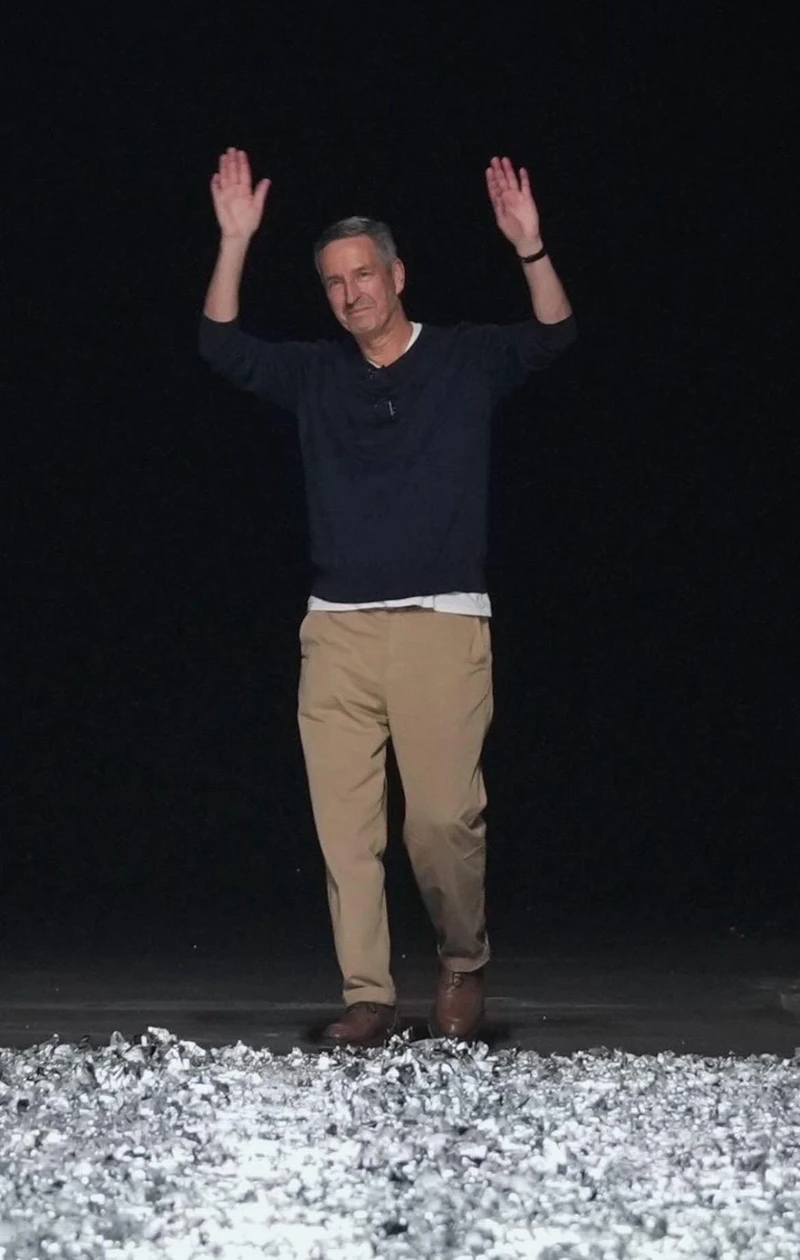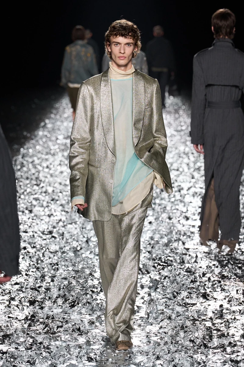 今年3月時,Dries Van Noten宣布將離開個人同名品牌,卸下 創意總監職位,而2025春夏系列便是他在Dries Van Noten設計的最終秀,秀場鋪滿了飄逸銀鉑,不時呼應到金銀光澤全新服裝,而他愛用的花卉元素也沒少,能在日常裝束中看見,發表結束後可以看到Dries Van Noten並不難過,露出笑容與圈內設計好友Pierpaolo Piccioli、Thom Browne、Haider Ackermann……開心合照聊天,因為他正想告訴大家「There is no Beginning, no end.」他的離開並不代表結束。