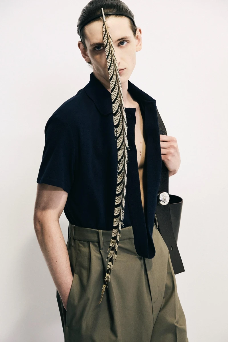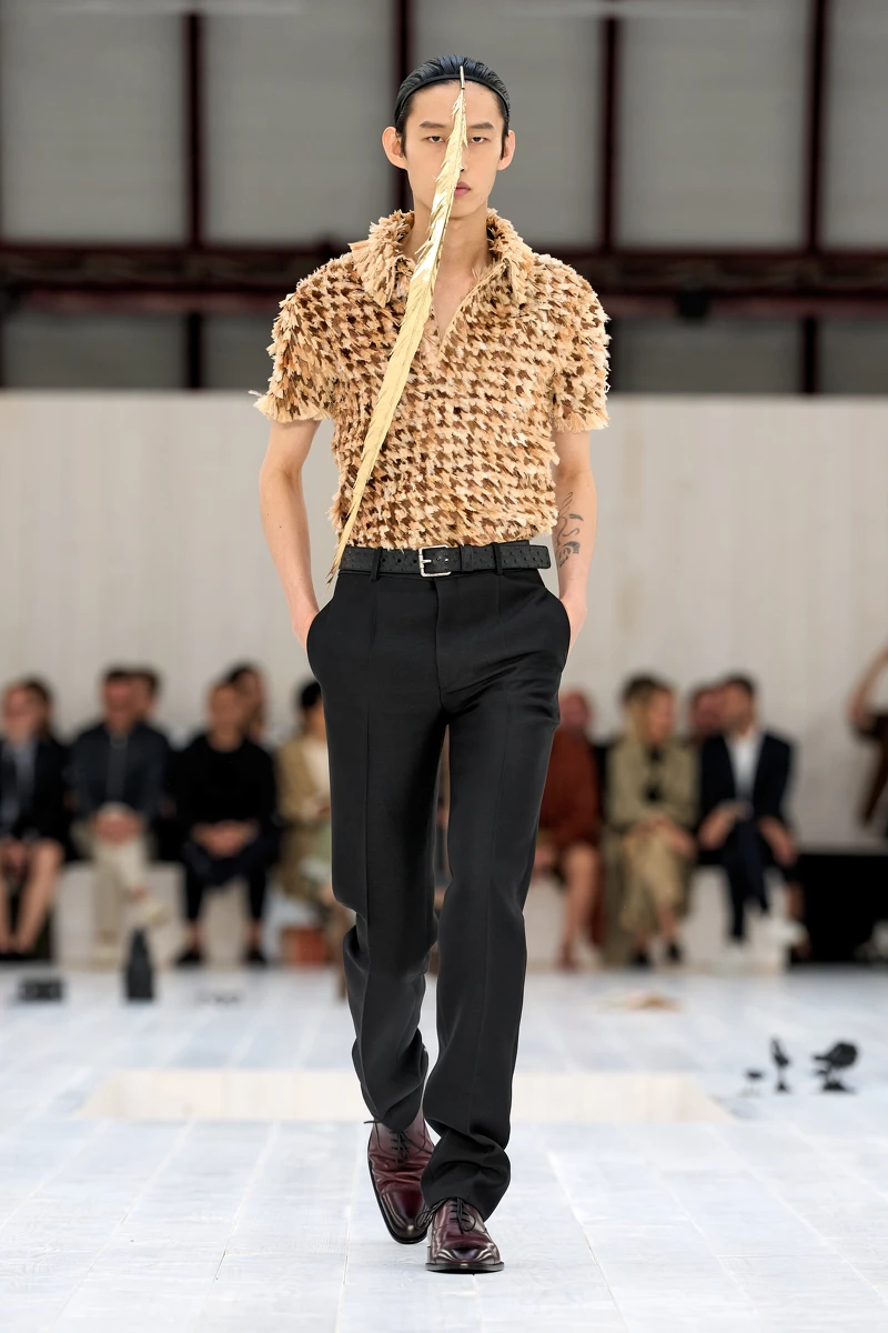 Loewe 2025春夏男裝系列似乎沒有像以往處處充滿驚奇,在服裝上顯得簡練、日常、好駕馭許多,俐落的法式風格低調之中,能看見許多工藝細節。不過創意總監Jonathan Anderson還是留有最具話題的一手,大秀上模特兒們幾乎每一位都在眼前掛著一到數根的超長羽毛,以髮箍的形式製成特殊臉飾,就跟秀場放置的諸多20世紀藝術家作品一樣,你不用特別去想這樣的作品藏著什麼含意,你覺得它是什麼就是什麼,藝術本就是留給觀眾自行領會。