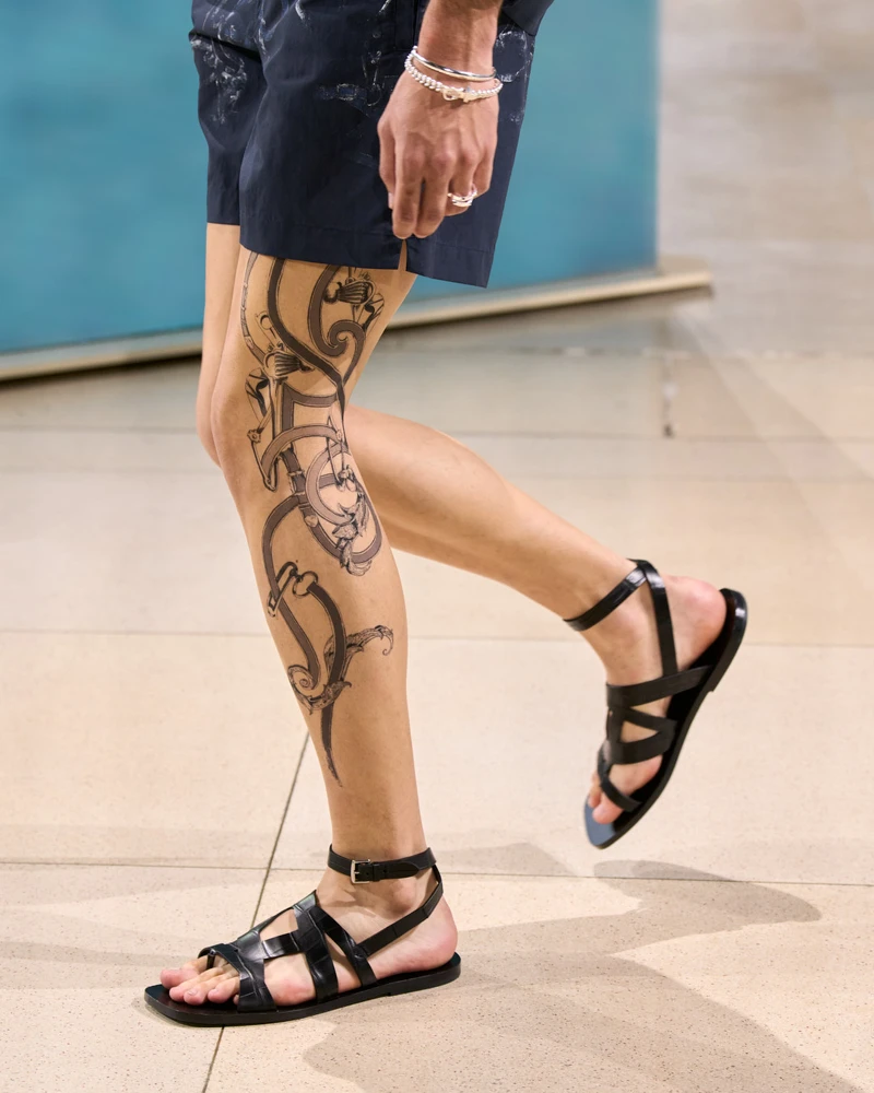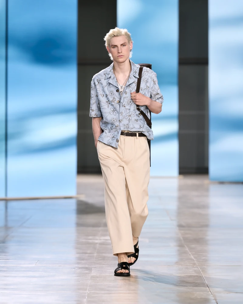 愛馬仕2025春夏男裝系列於巴黎耶納宮發表,秀場被打造為波光粼粼的水邊,呼應本季的服裝配色主題——土耳其藍、海洋藍和海軍藍,加入抹茶綠、荔枝紅、餅乾色……展開對話,短袖襯衫、背心、口袋夾克……全是夏日休閒的基本款品項,寬鬆九分西褲搭配自在舒適的涼鞋,是組成本季的造型公式,給人帶來一股清涼的感受,彰顯品牌歷史的馬術元素,則以彎曲圖騰從服裝上,一路延伸到模特兒的肌膚上。