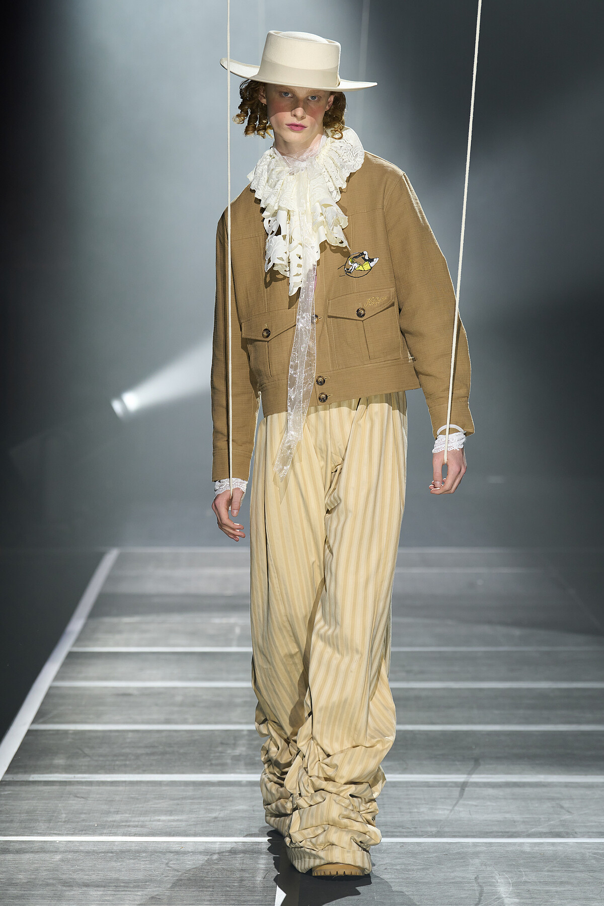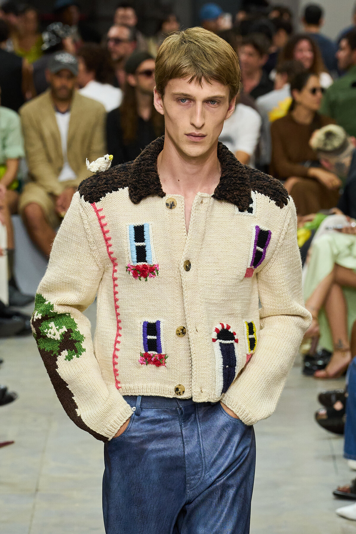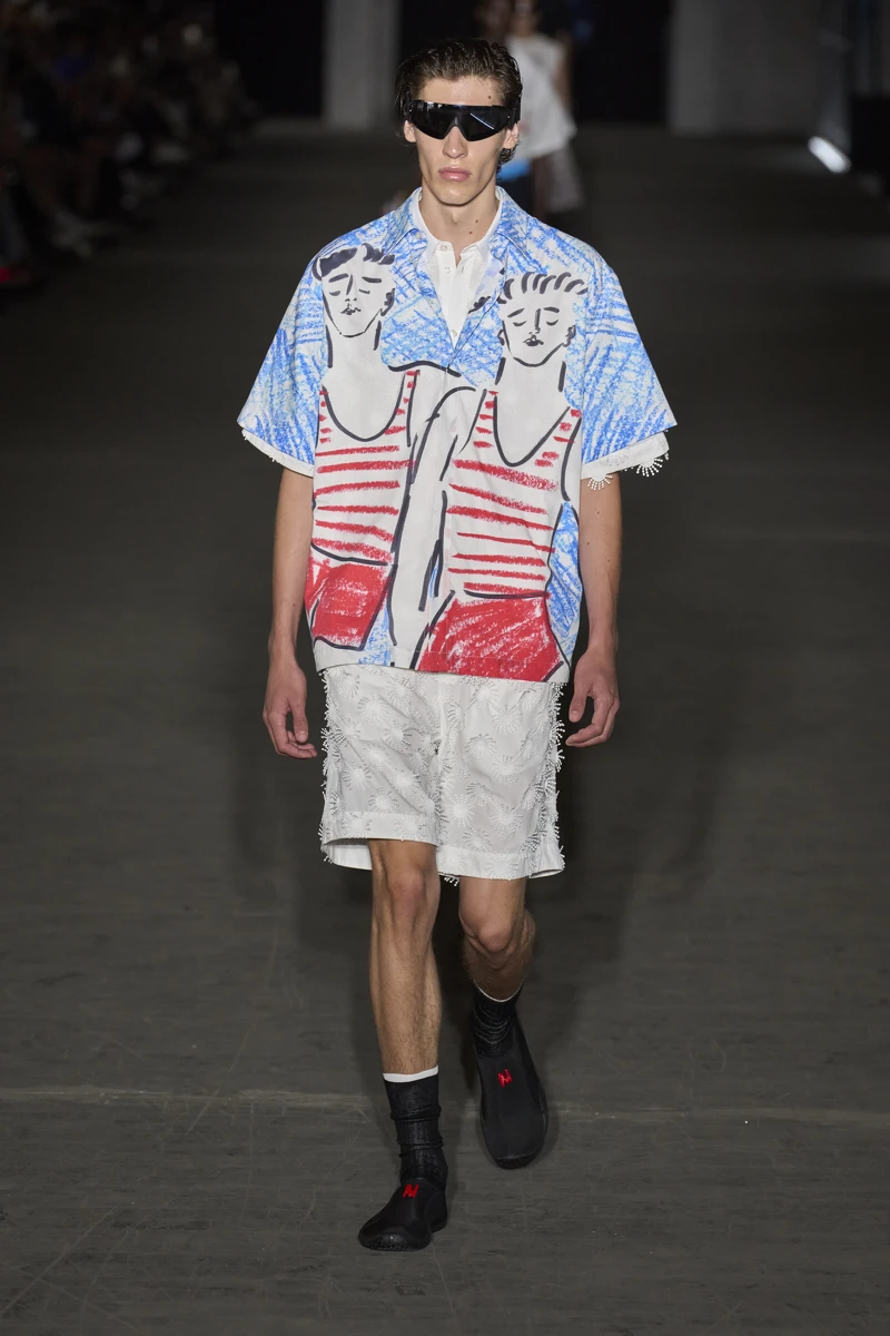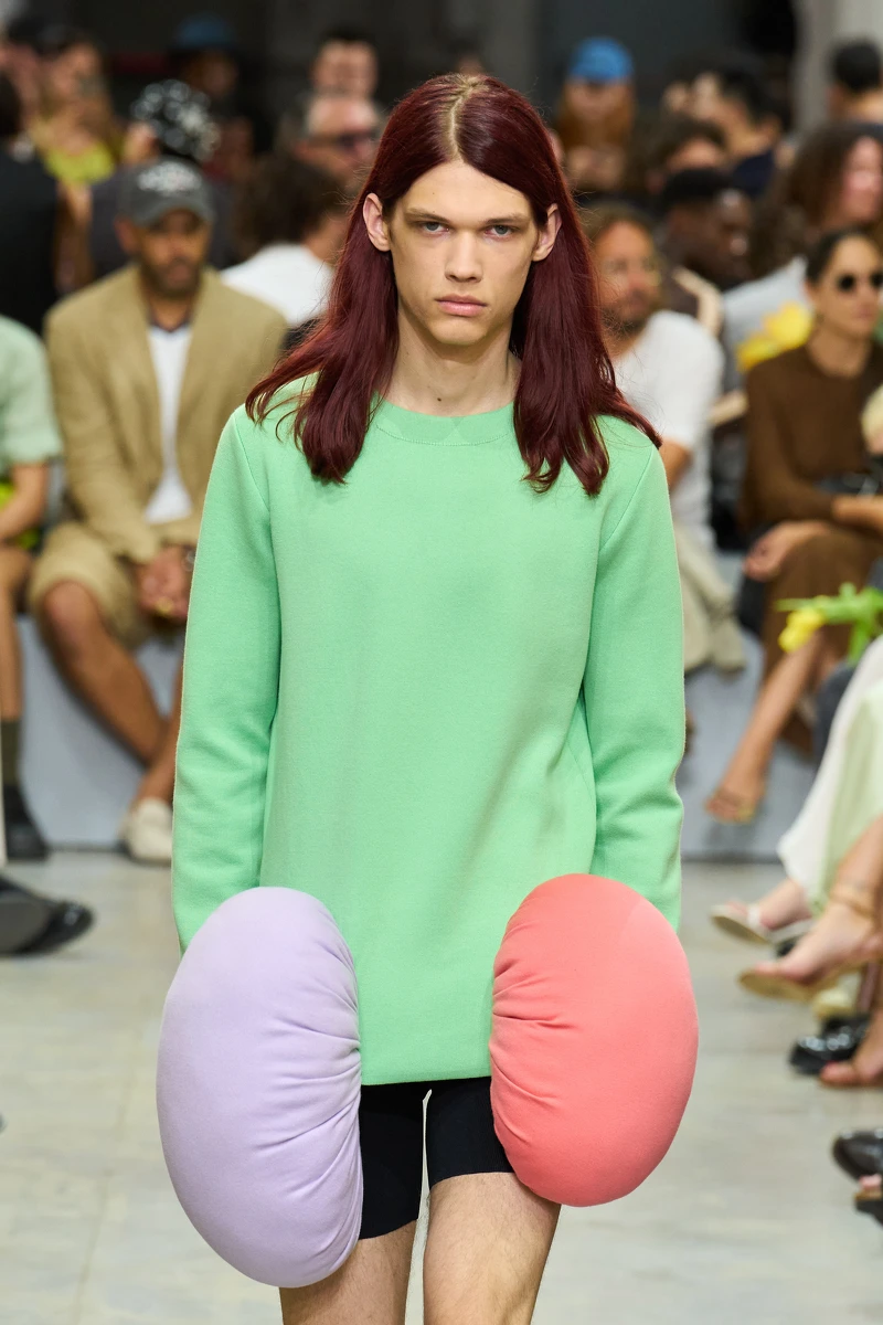 本季男裝的一大亮點是設計中的幽默性與童趣度。設計師們從童年回憶中汲取靈感,將俏皮的元素融入到時裝設計中,或是遊走於藝術與幽默之間,大玩創意解構服裝的輪廓,充滿玩味的表現。天才設計師 Jonathan Anderson 個人品牌 JW Anderson 2025春夏系列散發出濃厚的荒謬美學,以帶襯墊的輪廓、碩大的剪裁、宅邸的編織圖案展現這位設計師的標誌性俏皮風格。Gucci 秀場宛如一個盛夏的海岸衝浪場,模特們穿梭在城市與海濱之間,以充滿了色彩斑斕的印花和精緻的刺繡,讓人不禁回想起兒時的美好時光。這些設計不僅為男裝帶來了新的活力,也展示了時尚不應該被嚴肅拘泥的態度。