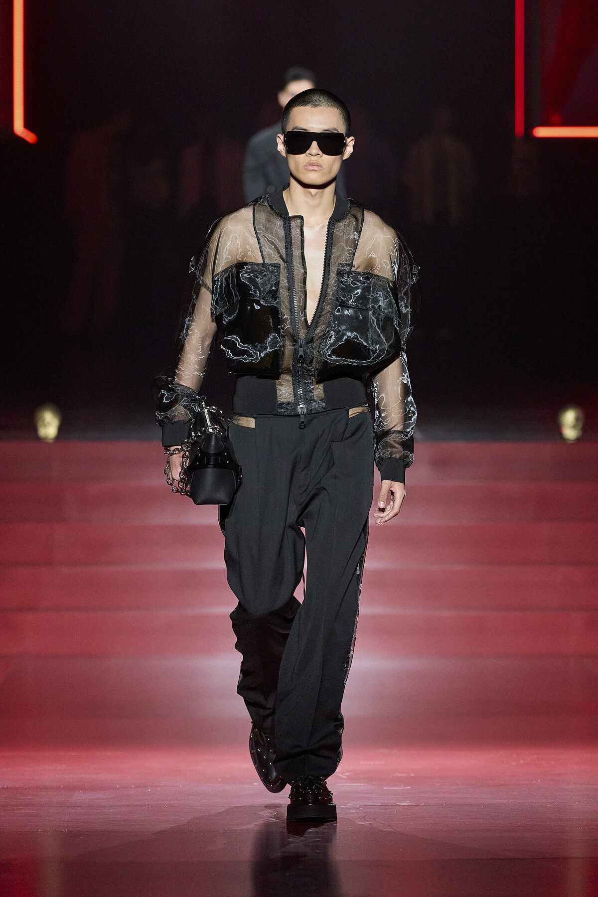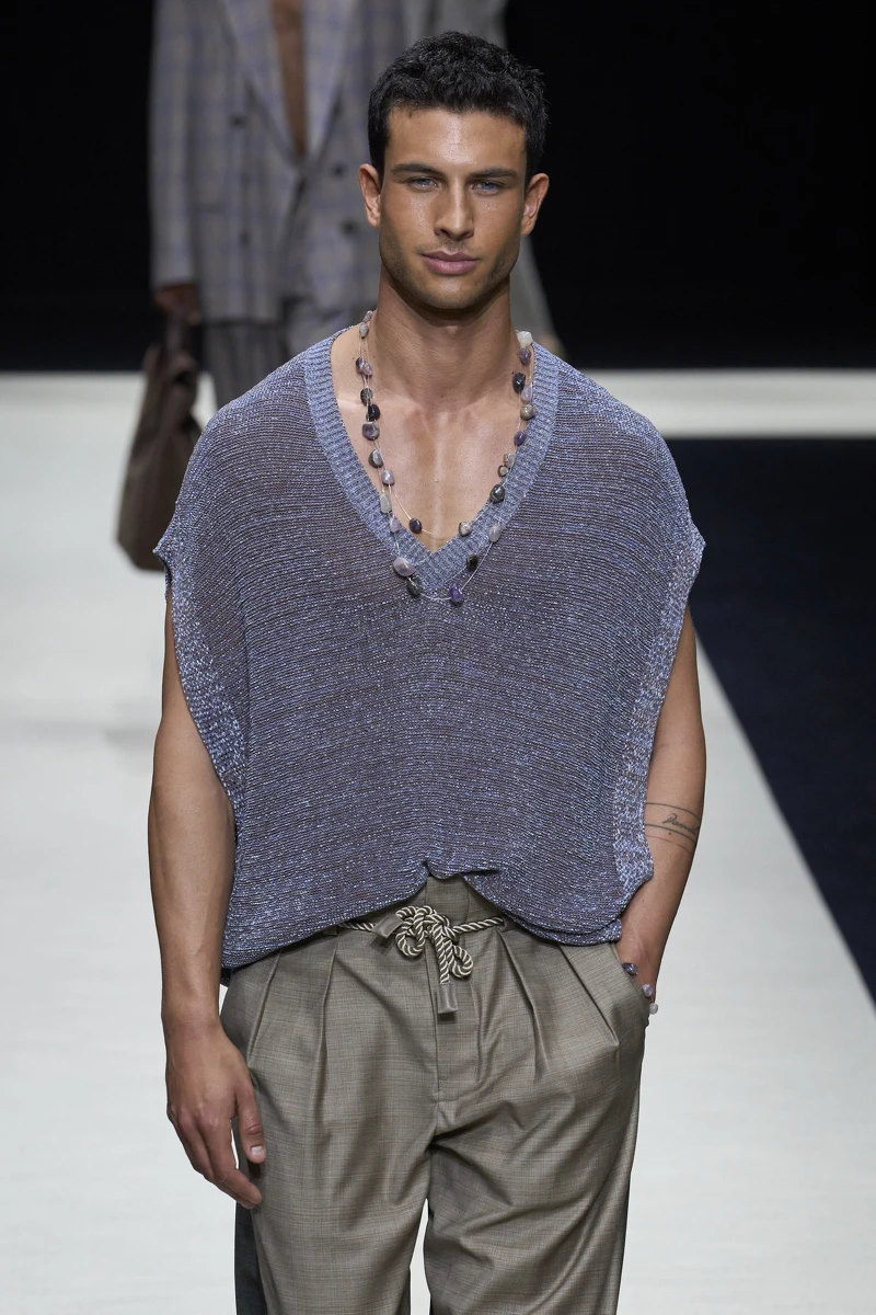 鏤空和透膚設計在本季男裝週中大放異彩。Dolce & Gabbana 和 Fendi 秀場上,模特們穿著鏤空設計的服裝,這些服裝不僅展現了設計師精湛的工藝,也在視覺上創造出一種若隱若現的男性美感。透膚的面料運用增加了服裝的層次感和設計感,讓整體造型更加輕盈而性感。這種設計不僅突顯了男性的自信與性感,也為男裝注入了更多的科技面料的創新元素。