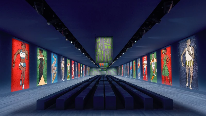 得益於工業革命和針織面料的發明,1920年代的女性開始採用更適合運動的新式服裝。Maria關注到整整一世紀前的巴黎奧運會,並提到當時女性運動員Alice Milliat的不懈倡導,成功幫助女性800米田徑比賽正式進入1928年的阿姆斯特丹奧運會。在每年舉辦 Dior 高級訂製服秀的羅丹博物館內,Maria受到古羅馬馬賽克的啟發,牆上鑲嵌了在燈光下熠熠閃耀的馬賽克壁畫,展示了穿著體育服與手持負重的女性運動員。以美國女性藝術家與女權倡導者 Faith Ringgold 的作品為創作基礎,並由 Dior 定期合作的印度 Chanakya 工藝學校的工匠複製。各種細節體現了Maria向所有自古至今克服各種偏見和障礙,確保公平競爭的女性運動員致以深切的敬意。