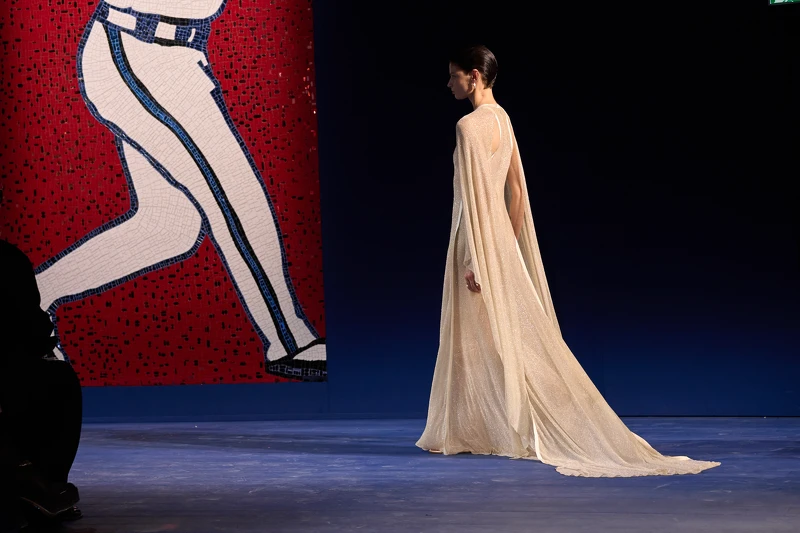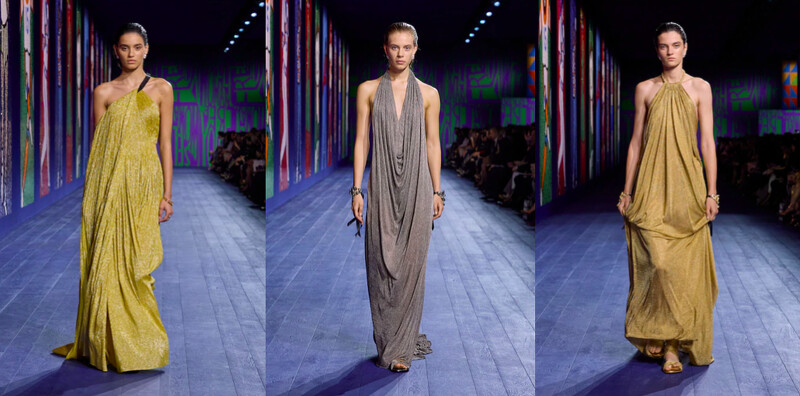 白色波紋綢緞(Moire)和黑色天鵝絨的褲裝,配上從褲腰懸垂的片裙(Peplos,古希臘充滿垂墜感的寬鬆長袍),捕捉到一種既放鬆又精緻的氛圍,細緻的亮片緊身衣搭配精緻的西裝外套,重新詮釋了正式晚裝的嚴肅性。閃閃發光的流動金屬長裙、帶有坦克背心線條的蜜色金屬披肩長裙,以及像是象徵著勝利女神一般,覆蓋金色羽毛的金色連體衣。儘管簡單,這些設計依然為晚裝增添了華麗變化,令人十分期待未來在紅毯上的展現。而一套以皮革肩帶懸掛的金色褶皺不對稱長裙,布料的閃耀與牆上鑲嵌相互輝映。最後選用優雅的銀色的垂墜長裙,與代表最高榮譽的金色(金牌)為這個系列劃下了完美的落幕。