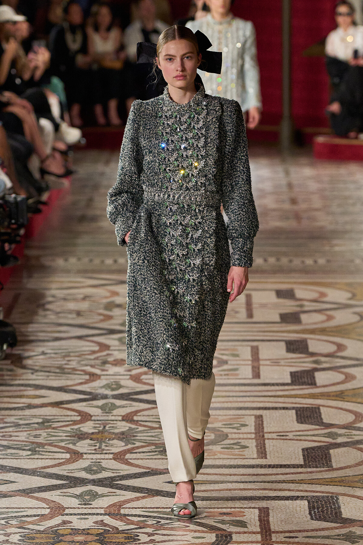 蝴蝶結這一經典元素也重複登場,閃耀的亮片與珍珠鑲嵌而成的金色蝴蝶結墜飾,隨意地點綴在黑色外套裙上。薄荷綠塔夫綢的裙擺隨著Sara Grace Wallerstedt的步伐翩翩起舞,肩上懸掛著黑色蝴蝶結,與小黑色針織連體衣相得益彰,演繹出Chanel一如繼往的優雅詩意。