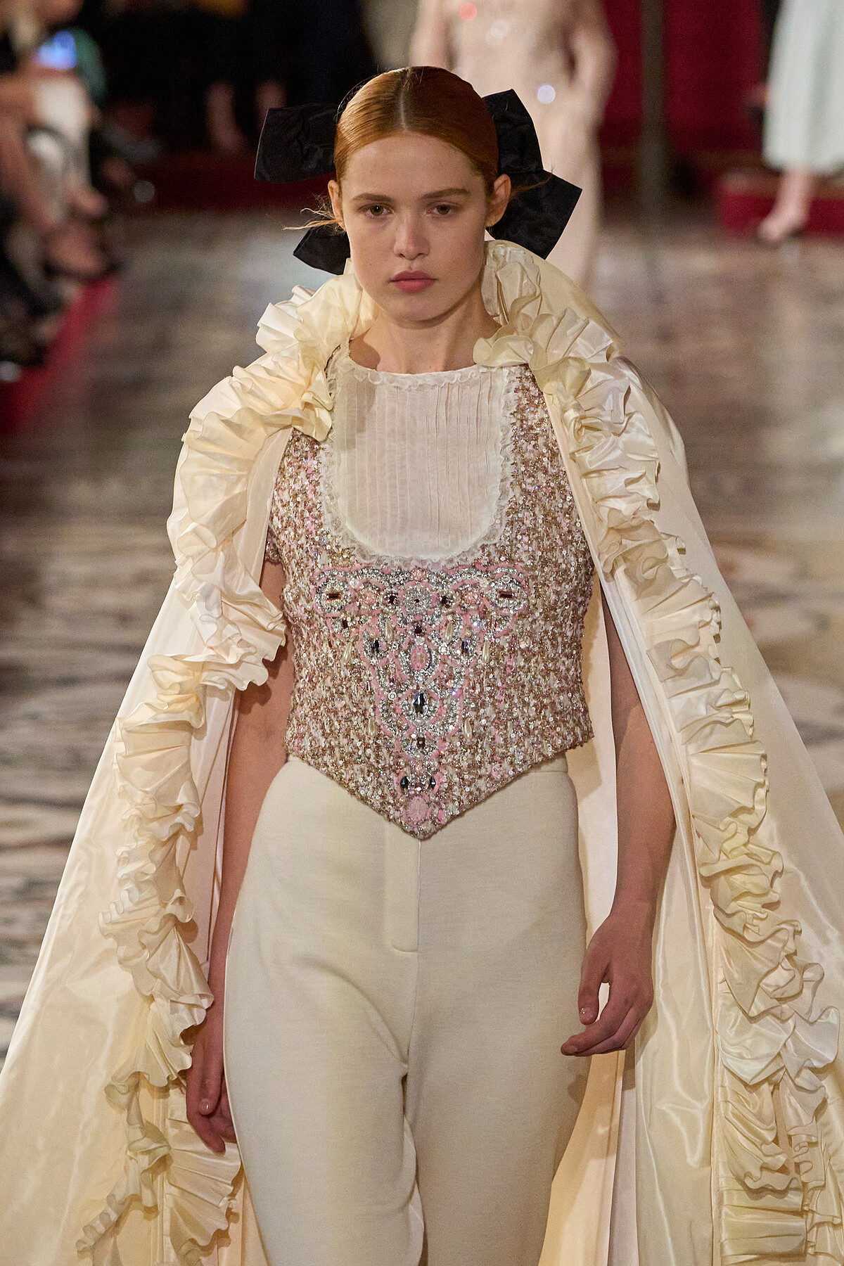 隨著鈴聲戛然而止,耳邊飄來60年代英國搖滾樂團Rare Bird的低語男聲,聚光燈下的名模Vittoria Ceretti緩緩推開歌劇院古老的木門。她披著一件黑色絲緞塔夫綢大斗篷,高領襯托出她精緻的臉龐,頭髮用黑色緞帶繫成巨大的蝴蝶結,內搭一件鑲嵌精緻花瓣裝飾的米白色上衣。這充滿戲劇性的開場,傳達了品牌一如既往的高雅品味與精緻奢華。