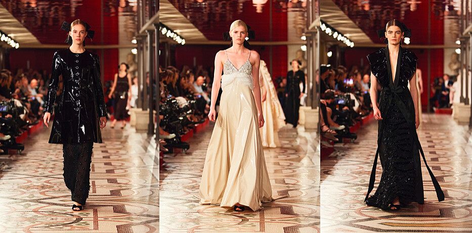 漆皮面料的巧妙運用,使晚裝設計脫穎而出:合身的黑色單排扣長外套與柔軟的花朵裝飾長褲相得益彰,彰顯出獨特的優雅。V領低胸連衣裙的袖口皺褶,採用嶄新的黑色漆皮材質,增添現代氣息。金色織線上衣點綴著白色羽毛,米白色漆皮裙身在劇院燈光下閃閃發光,營造出濃厚的舞台張力,服裝本身訴說著一段戲劇性的詩意。