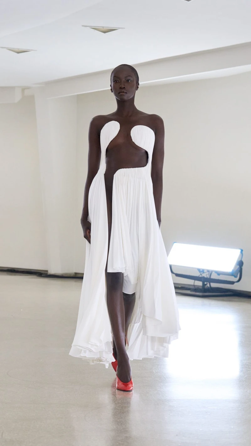 2025春夏總體來說頗有80年代的影子,Pieter Mulier在Alaïa的基礎構架裡加上自己的語言,像是這件在社群上引起最多討論的白色洋裝,輕盈飄逸,曲線中勾勒出虛實的對比,也更能感受出服裝在身體上的流動感以及空間感。