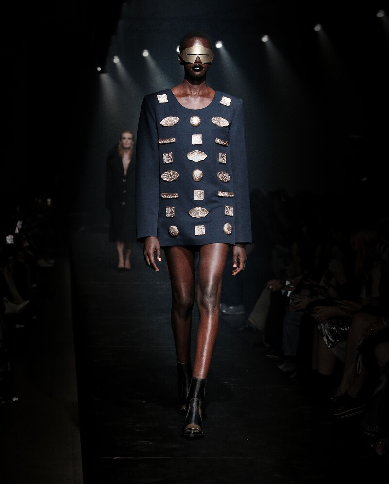 秀上的一大亮點,莫過於服裝上的手掌圖樣。這些手印,來自幕後團隊之「手」,經掃描爾後轉印到牛仔褲、針織等面料上,除了有前述所提到的身份話題,這也是和交友軟體Tinder的聯名!近兩年在美國,墮胎議題再次成為辯論議題,各州政府各持不同意見,因而有slogan「不要干預我們的身體」( Ban off our bodies)的出現。透過秋冬的暗黑色調,配上鉚釘、漆皮的元素,更為2024秋冬系列注入一股叛逆的獨立精神。