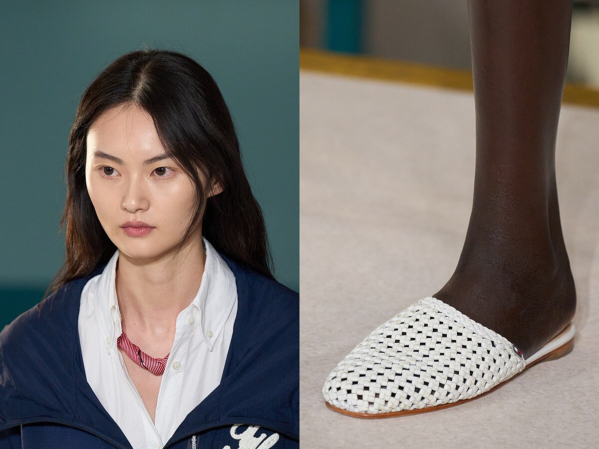 不論是在男裝、女裝,Tommy Hilfiger 2025春夏系列搭配了大量的絲巾項鍊。營造休閒、海軍風格的焦點單品絲巾,這回不是以常見的領巾打法出現,而是以纏繞的方式扭緊成一圈,搭配在襯衫內或上衣外,並帶來多種花樣,成為本季的焦點單品;而模特兒們的腳下則多數踩著輕便的編織拖鞋,簡約中性的設計不侷限風格、更不侷限性別。