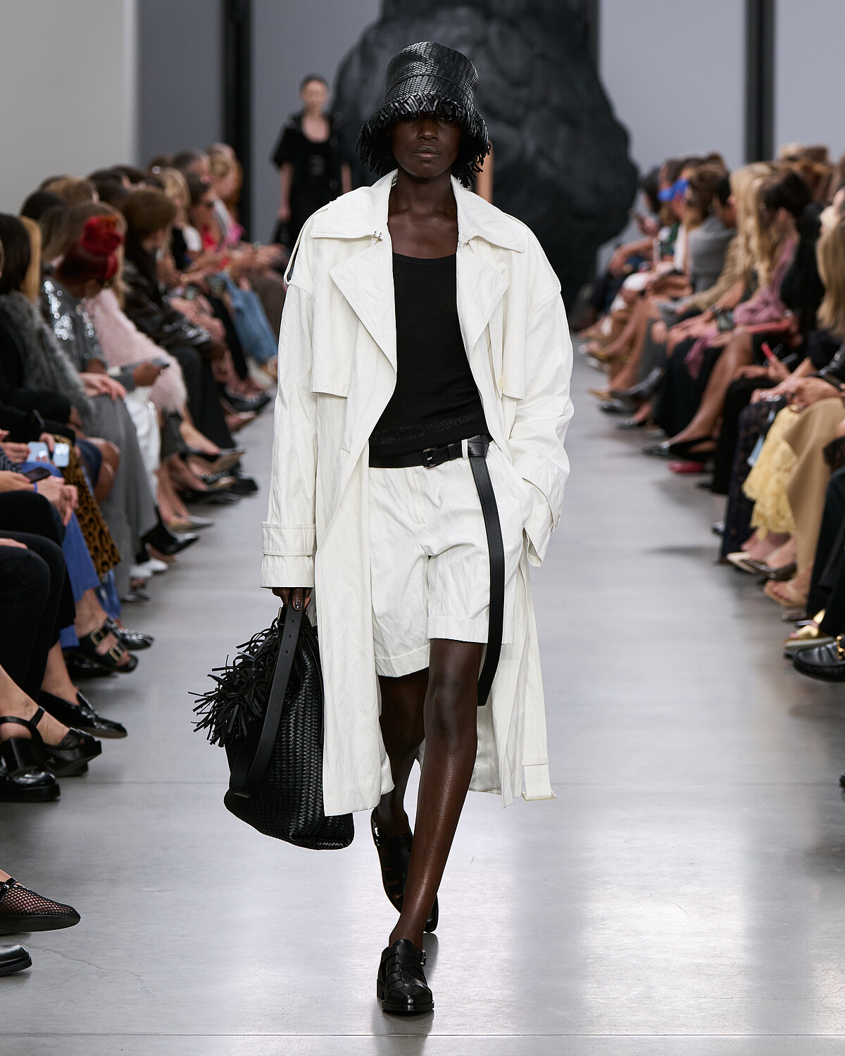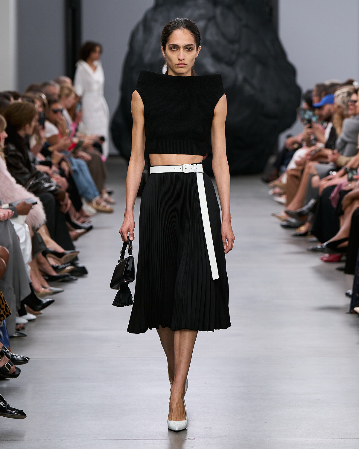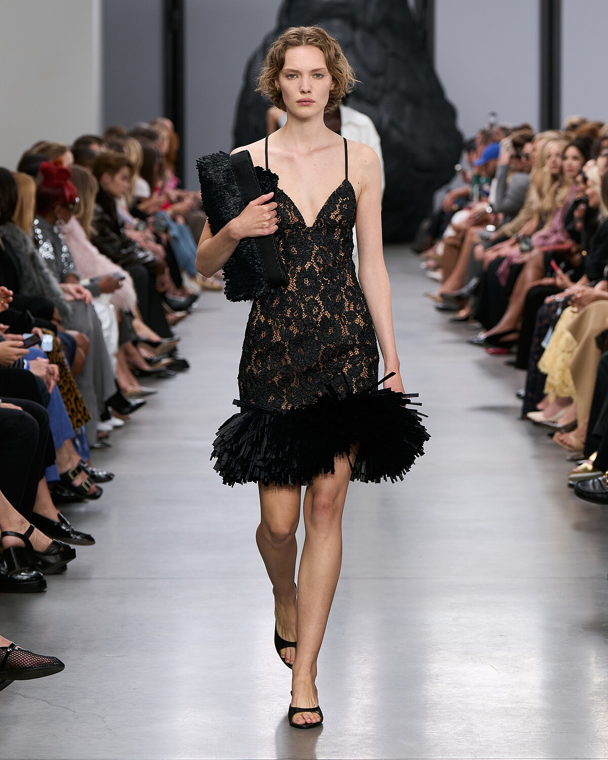 在開場的前22個造型,全都是黑灰白色系的造型,這讓人聯想到今年Netflix再次翻拍同文本爲影集《雷普利》(Ripley),以黑白的手法拍攝,兩者都散發著一種冷冽卻又層次分明的光影效果。除了顏色上的黑白色對比,Michael Kors也透過面料的拼接來呈現出彼此之間的對比效果,像是蕾絲與草編的結合,又或是皮革面料上的珠飾刺繡。