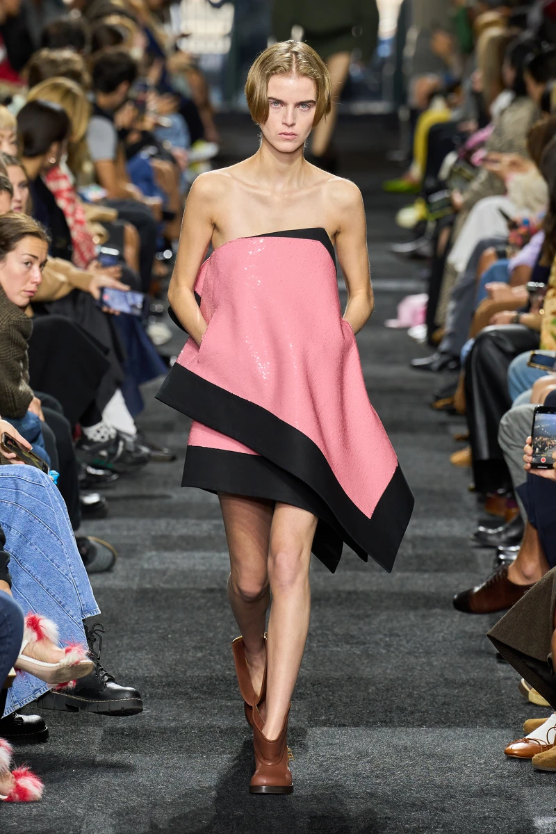 圓弧形的裙擺宛如輕盈地懸浮在空中,運用面料特性展現出對材質的精湛掌控,彷彿時間靜止般,將觀眾帶入 JW Anderson 的超現實世界。這個系列呈現了一種全新的服裝定位,巧妙平衡了日常街頭風格與精緻禮服,既不刻意又引人注目,無論是紅毯場合還是日常穿搭都恰到好處。