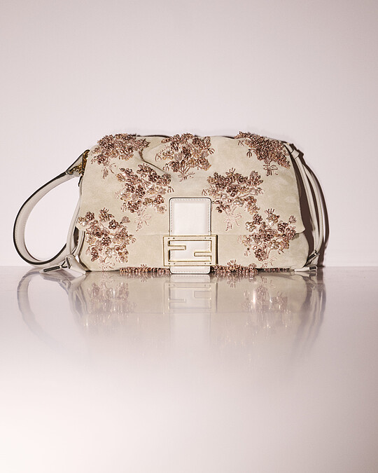 此次的配件系列,包款設計可說是一大重點,柔軟的特質與精湛的刺繡工藝都為手袋增添不凡魅力,其中更是對品牌創辦人 Adele Fendi 的致敬,秀場音樂中更帶出 Anna Fendi 與女兒 Silvia 的對話,聊著創辦人同時為 Silvia 祖母的 Adele Fendi,將這個以「家」為本的情感聯繫傳達給觀賞這場秀的眾人。