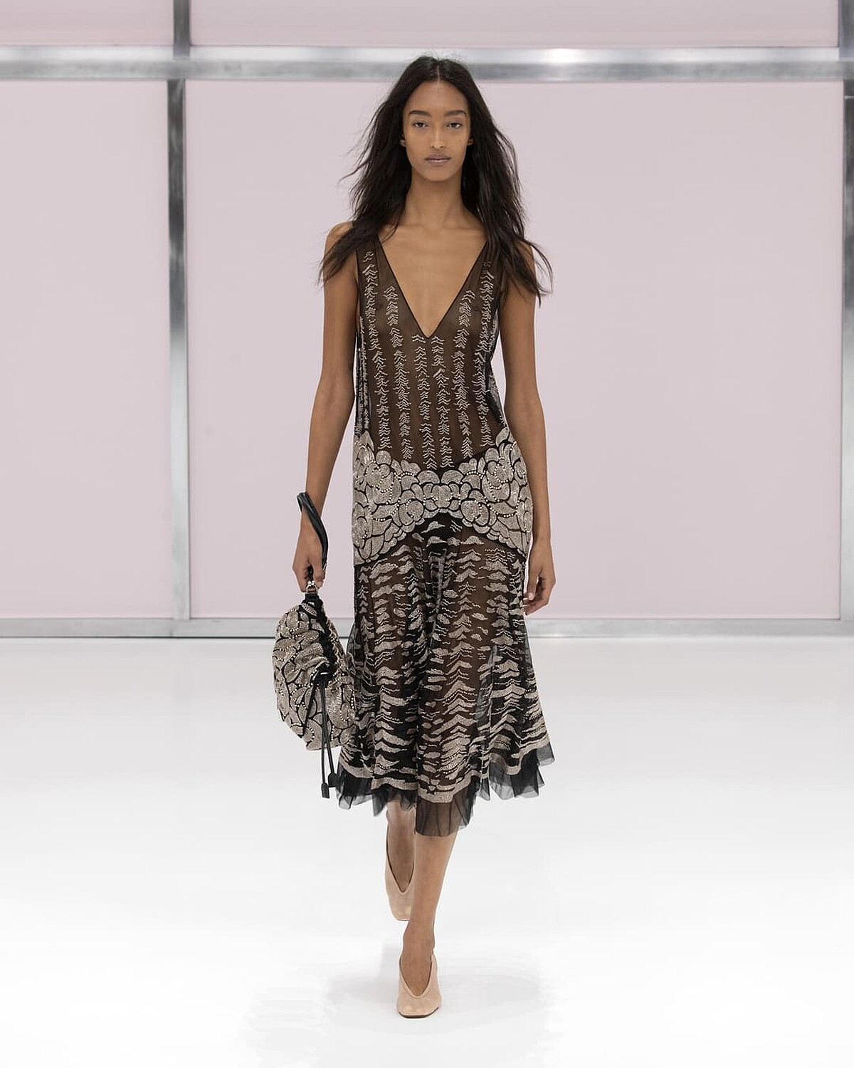 本季 Fendi 從 1920 年代作為起源,重新思考對於「現代感」的詮釋方式。,同時品牌也於 1925 年創立,是品牌的源起,更別具意義。現代主義基於當代設計有著很重要的位置,此次品牌高級訂製服與女裝藝術總監 Kim Jones 將這些概念融入創作,包括整個秀場的意象,都具有現代感的沉浸式氛圍,讓在場賓客投入其中,聯繫了 Fendi 的經典、當代及未來的無限可能。