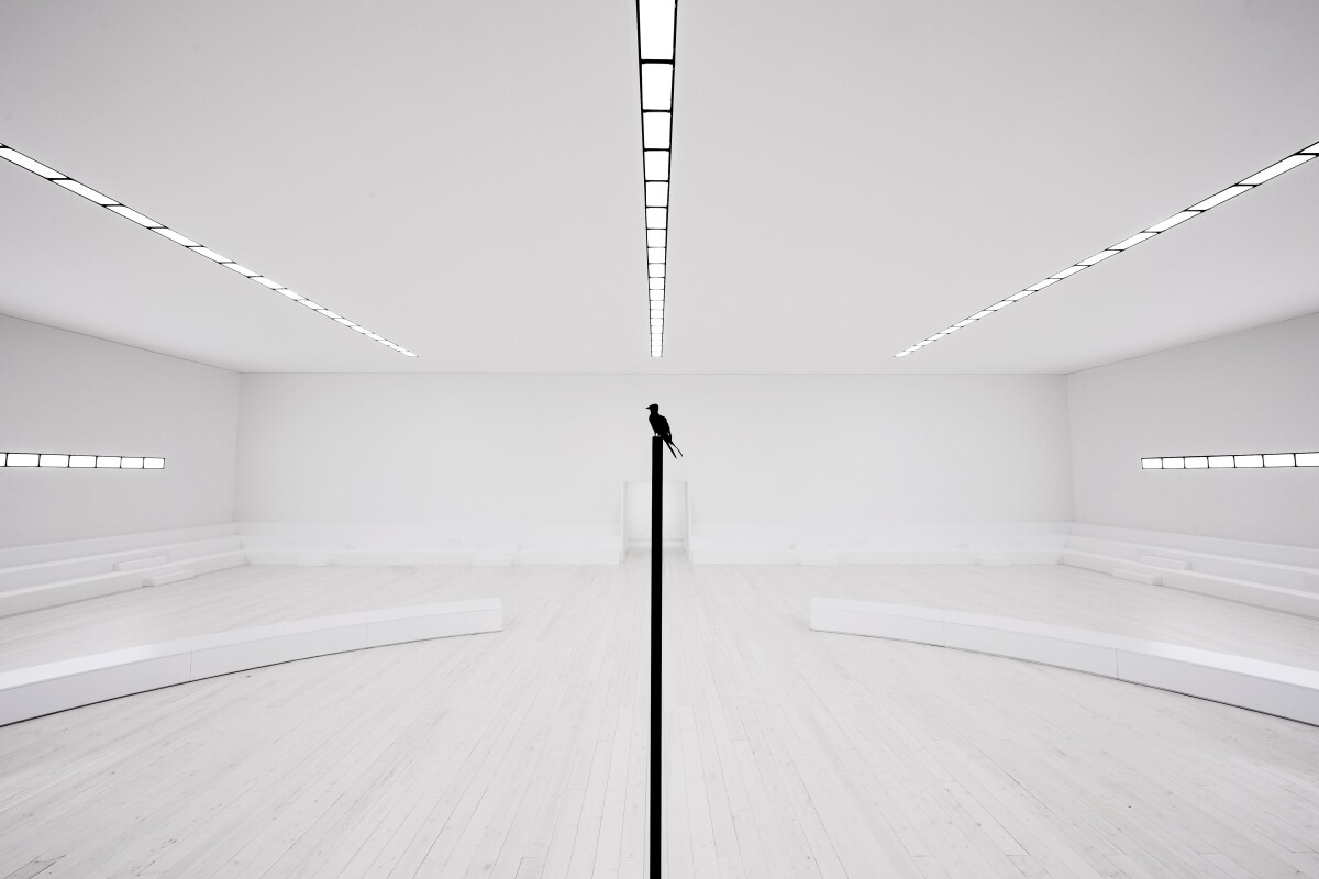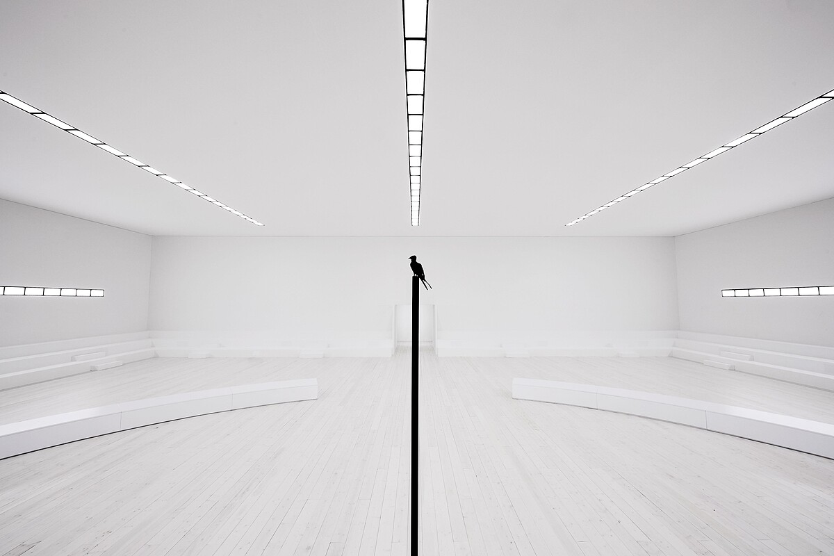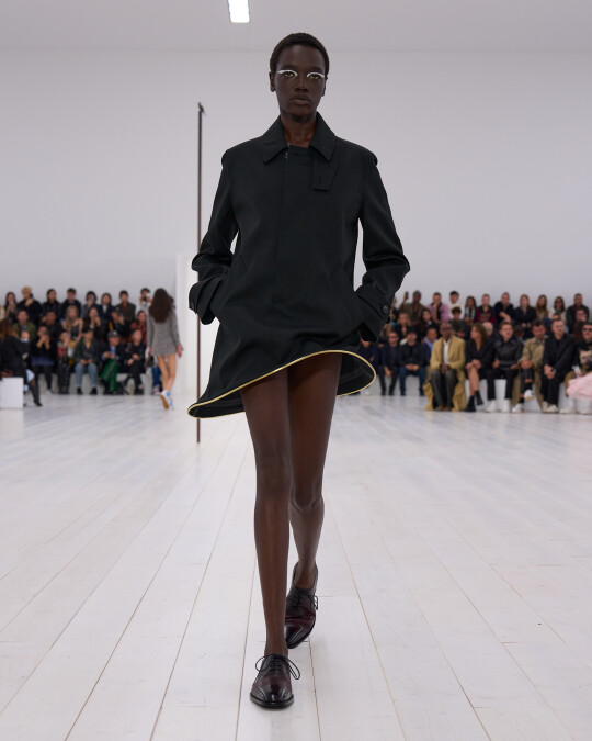 這裡就像是科幻電影中時常出現的四次元空間,感覺在純白異世界裡什麼都可能發生。Loewe 2025春夏女裝系列大秀秀場內部是一片全白的空間,中間佇立著一根高柱與一隻小鳥,是來自英國藝術家Tracey Emin的雕塑作品《The only place you came to me was in my sleep》(2017年),她將鳥兒描繪成脆弱和堅韌的象徵,在片刻停歇之間,她鼓勵大家去想像鳥兒快要展翅飛翔、自由的模樣。