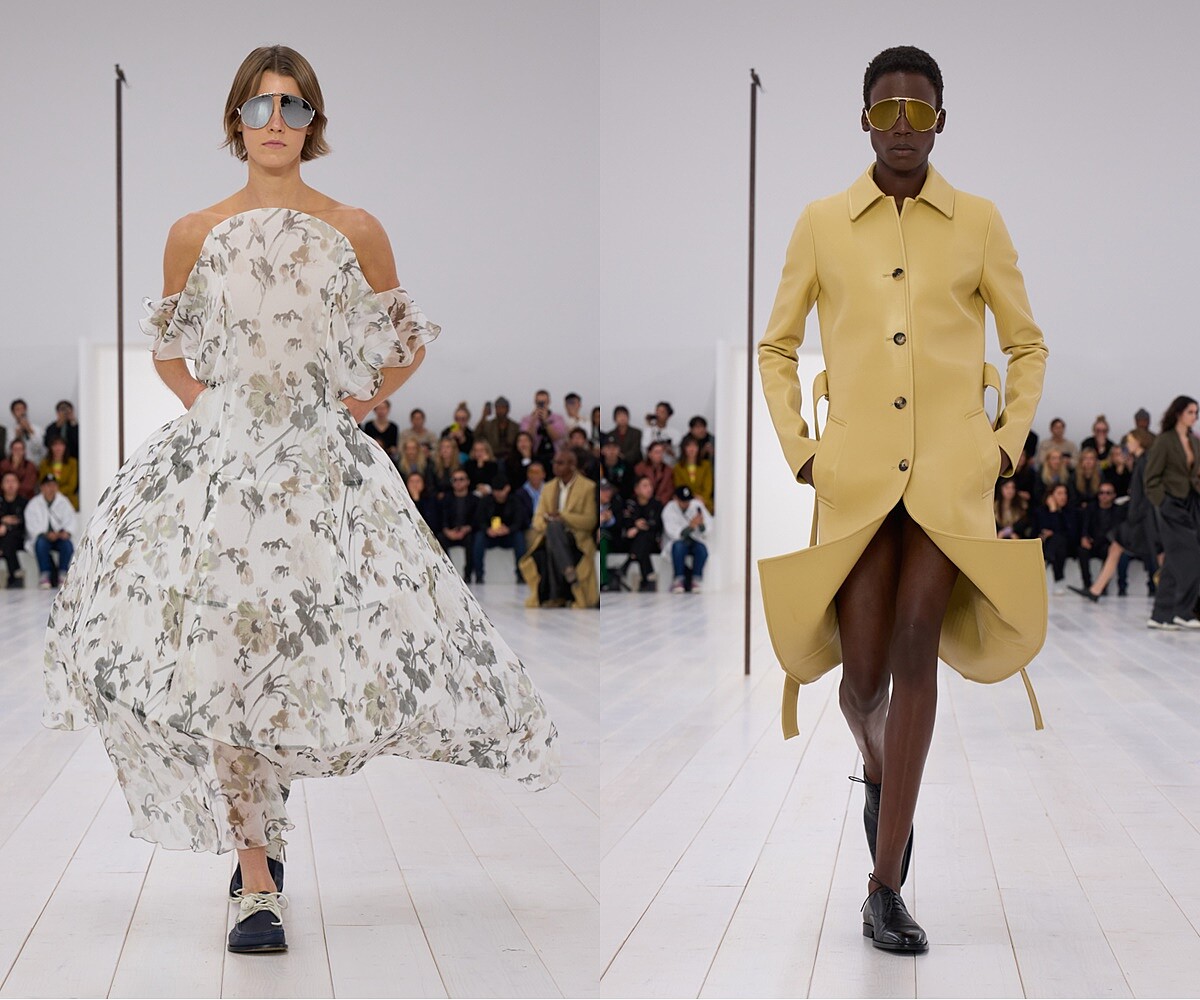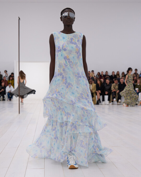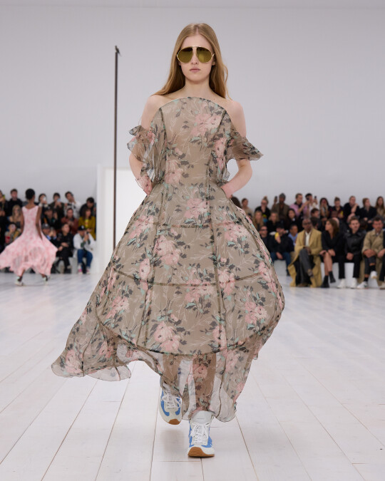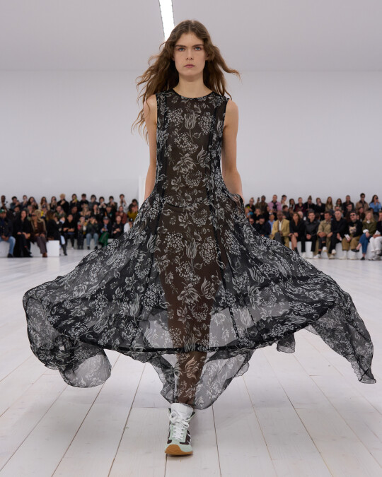 在Loewe 2025春夏女裝系列中,會發現服裝既定的輪廓已經消失,每一件洋裝、外套都很有自己的想法,飛得很自由自在!服裝常見的剪裁手法被簡化,改以流動弧線呈現,Jonathan Anderson在極輕盈的印花絲綢洋裝裡加入骨架和鐵線,讓衣服看起來就像是會飛一樣,擺動、彈跳得特別優雅動人,顛覆正常思維的效果,讓人有在夢境中一般的錯覺。