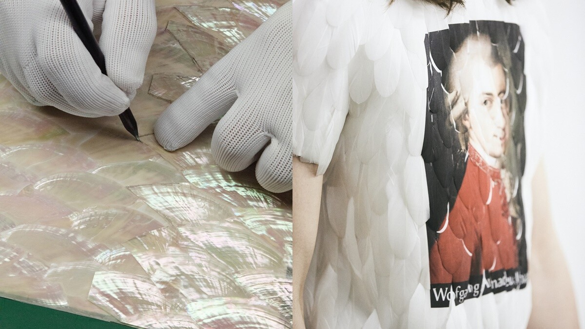 Loewe最新一季裡在面料上做了一些新的嘗試:用珍珠母貝切割、打磨出迷人偏光色澤,製成閃亮的短洋裝夾克;印著名畫的休閒T恤,也沒有想像中簡單,整件衣服其實是由羽毛覆蓋而成。