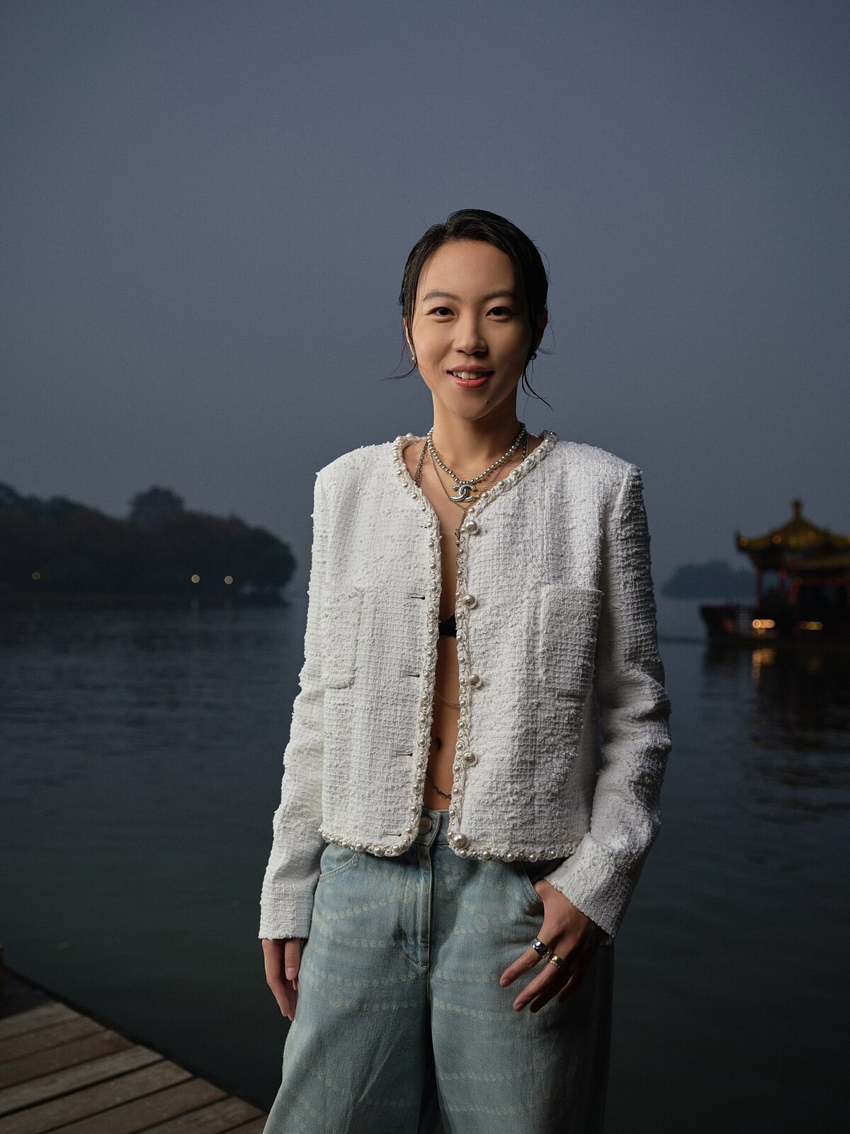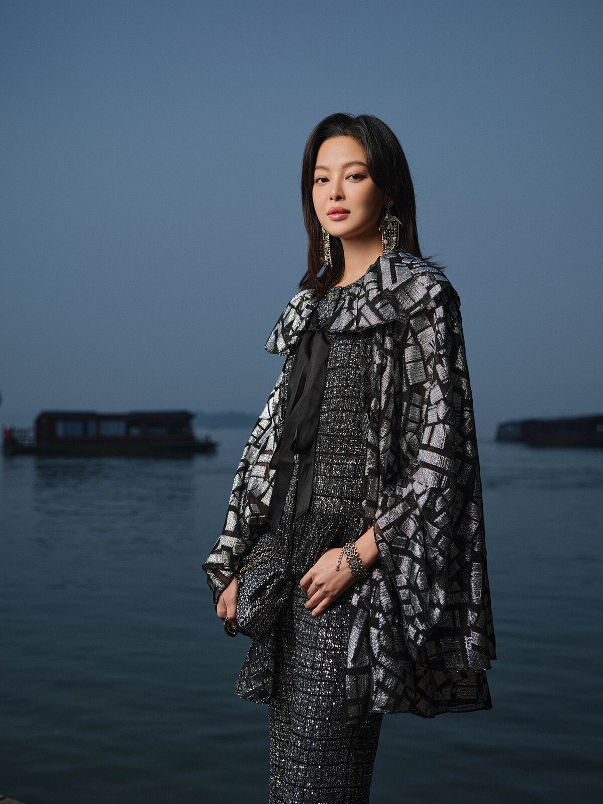 夜幕降臨,如詩如畫的西湖景緻在月光下顯得不太真實,湖面波光點點,就像是墜入湖裡的星辰光芒,映照著湖中央一座古塔與拱橋。這是香奈兒2024/25 Métiers d’art全新工坊大秀的發佈地——杭州西湖,這場以屏風為窗,結合現代與古典的百年對話,在深沉渾厚宛如地心深處迴響的震撼鼓聲下就此展開。