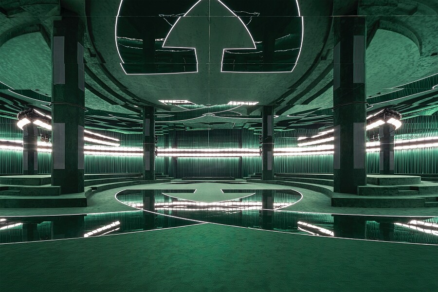 經典的Interlocking G字母印花是Gucci最為經典、象徵著品牌創始人Guccio Gucci的標誌,而這個標誌在今年迎來五十週年紀念並成為本次秀場空間的核心設計,作為首次男女裝結合的大秀的空間設計,就如同雙螺旋、陰陽,或無限的符號,象徵過去與未來的交會。