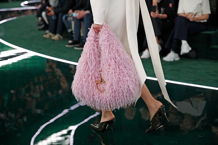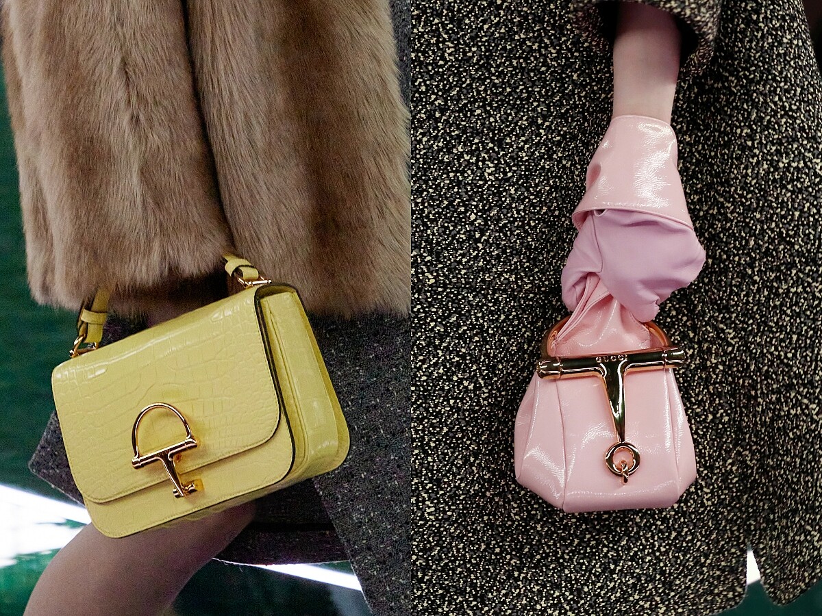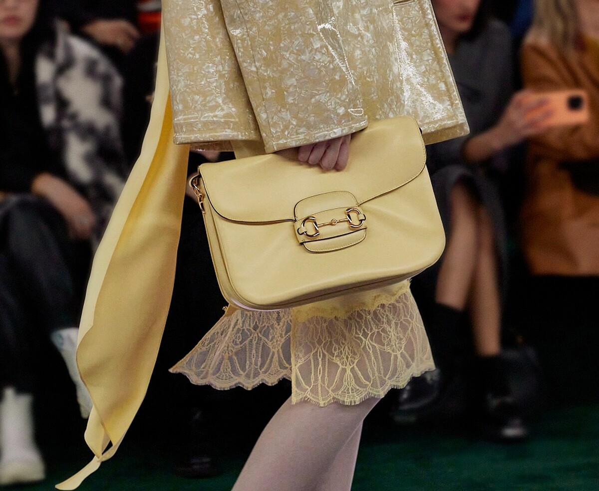 作為Gucci最具標誌性的設計之一,Horsebit馬銜鍊也在今年迎來70週年,除了1955馬銜鍊包在本季褪去方正硬挺的包型,換上柔軟皮革的設計之外,也有了全新的詮釋——「Half Horsebit」正式亮相,在包款、服裝、配件之中都能看見其身影,包括三角托特馬銜鍊手袋、漆皮迷你手袋、馬銜鍊腰帶等,同時在皮革拖鞋、飾品上也能看到馬銜鍊以不同大小的型態點綴。不僅是對過去的致敬,同時也是將品牌標誌轉化為時尚語言的展現。
