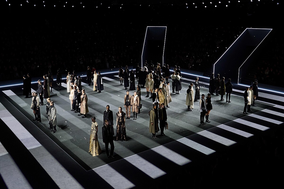 劇場導演 Robert Wilson 則以光影交錯的舞台,讓模特兒在色彩遞嬗的空間中行走,勾勒出變動的世界:從幽暗的深處至光亮的彼端,一座鞦韆、一隻史前鳥、冰川的輪廓浮現,彷彿歷史與未來的交界。