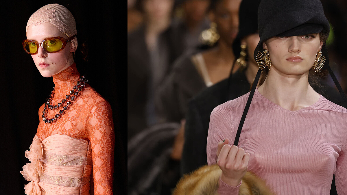 全新一季的設計,顏色使用多為柔軟的粉、玫瑰與奶油色調,搭配對比色系裝飾細節、蕾絲帽套、錯位剪裁,讓浪漫陷入一絲絲懸疑的情境。模特兒的步伐亦非自信從容,而更像猶疑的演員走入排練現場,隨時準備脫下某層面具。