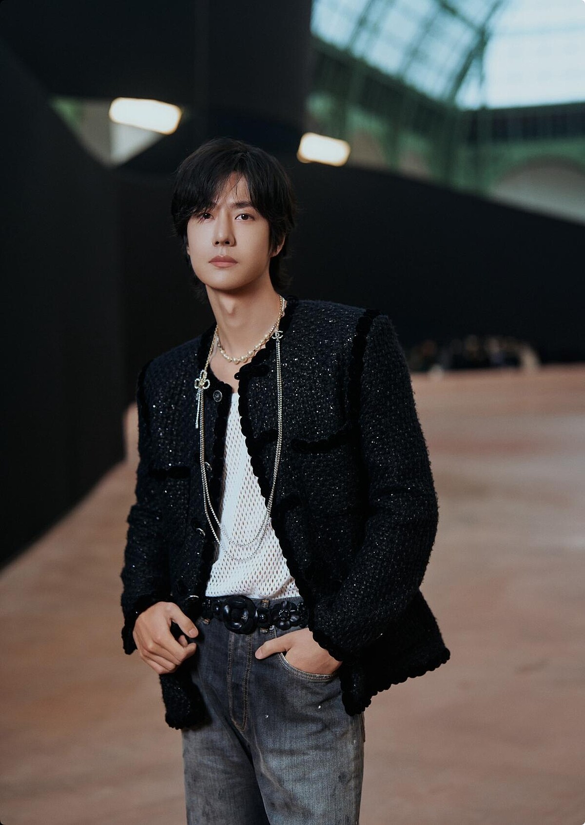 王一博選擇黑色造型,但卻一點也不低調,外套上有著點點細閃,內搭衫還是網眼鏤空的設計,處處都是搭配巧思。