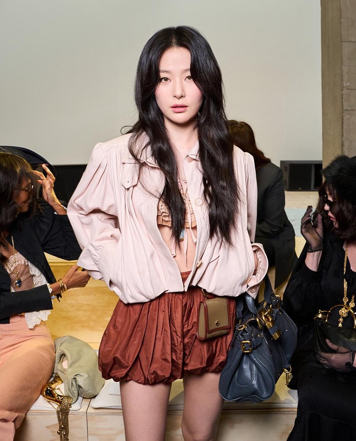 瑟琪近期帶來solo主打〈Baby Not Baby〉,展現了她的多樣音樂風格和實力,來到Chloé 2025 秋冬大秀,瑟琪以2025夏季系列淡粉色短版風衣搭配棕色燈籠短褲,酒紅色高跟涼鞋與金色配飾增添趣味,顯得輕盈柔美,手拎復刻版灰藍色Paddington鎖頭包,散發復古氣息。