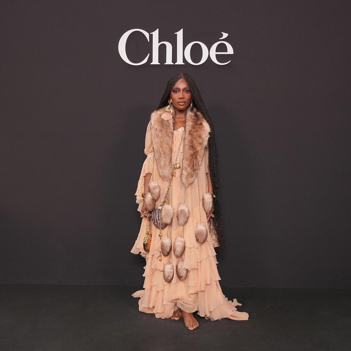 Doechii 以波西米亞風格亮相 Chloé 秋冬秀場,光腳造型別具一格,令人聯想到《海洋奇緣》的自由與靈動,進一步強化了波西米亞風格的隨性與自然,Doechii不僅在音樂領域取得卓越成就,亦在時尚界展現她大膽創新的風格。