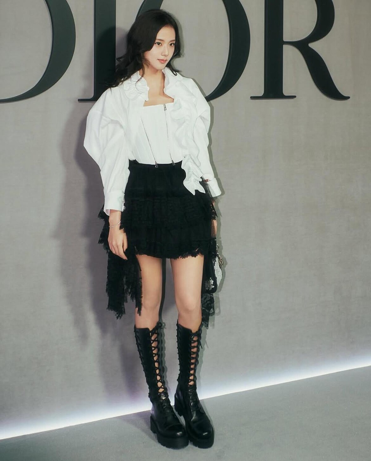 JISOO身着DIOR 2025春夏女装系列以白色馬甲胸衣搭配黑色薄紗半裙現身秀場,一頭舒展的波浪卷髮,展現出她高雅的魅力,此外她還特別受到 Dior 全球公關團隊的全程護送入場,看起來心情相當愉快,整個人散發著自信光芒,根本是童話中走來的公主!