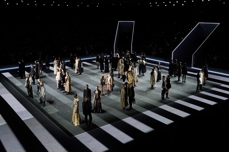 本季 Dior 選擇了一個極具戲劇性的伸展台設計,由視覺藝術大師 Robert Wilson 操刀,營造出一個充滿流動感的世界。灰黑色基調的舞台上,幾何條紋與對角線視覺效果帶來錯視感,呼應了整場秀對於時間與風格流變的探討。現場燈光變換,從深邃暗影過渡到柔和光芒,如同一場夢境式的敘事:一座鞦韆懸於空中、史前鳥的影像投射在幕布上,直到最終浮現冰山意象,象徵著時尚在時間洪流中的永恆與變遷。