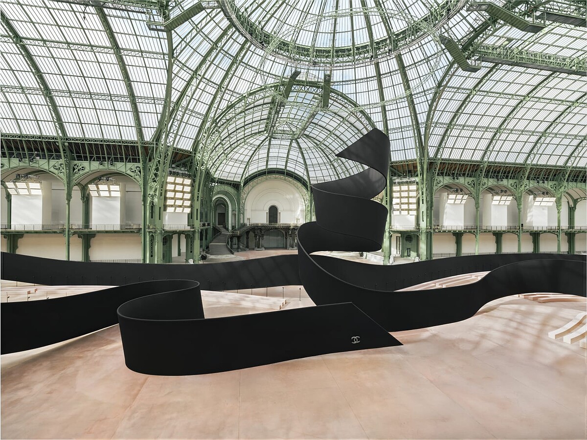 巴黎時裝週最後一日清晨,大皇宮(Grand Palais)玻璃穹頂緩緩地映照出冬末的薄霧與初春的光線,一條巨型黑色緞帶宛如弦索,自空中緩緩垂落,引領受邀的媒體賓客進入一場關於比例、錯視與女性輪廓的娉婷之旅。這正是香奈兒2025秋冬大秀的開場——一場由創意團隊與場景設計師 Willo Perron 攜手共同於現實之上撐起的輕盈幻覺。