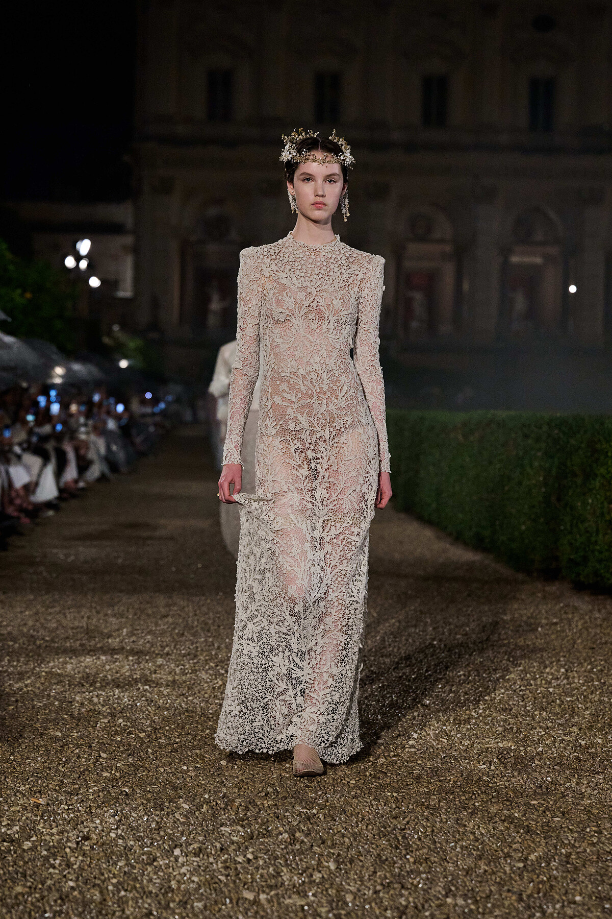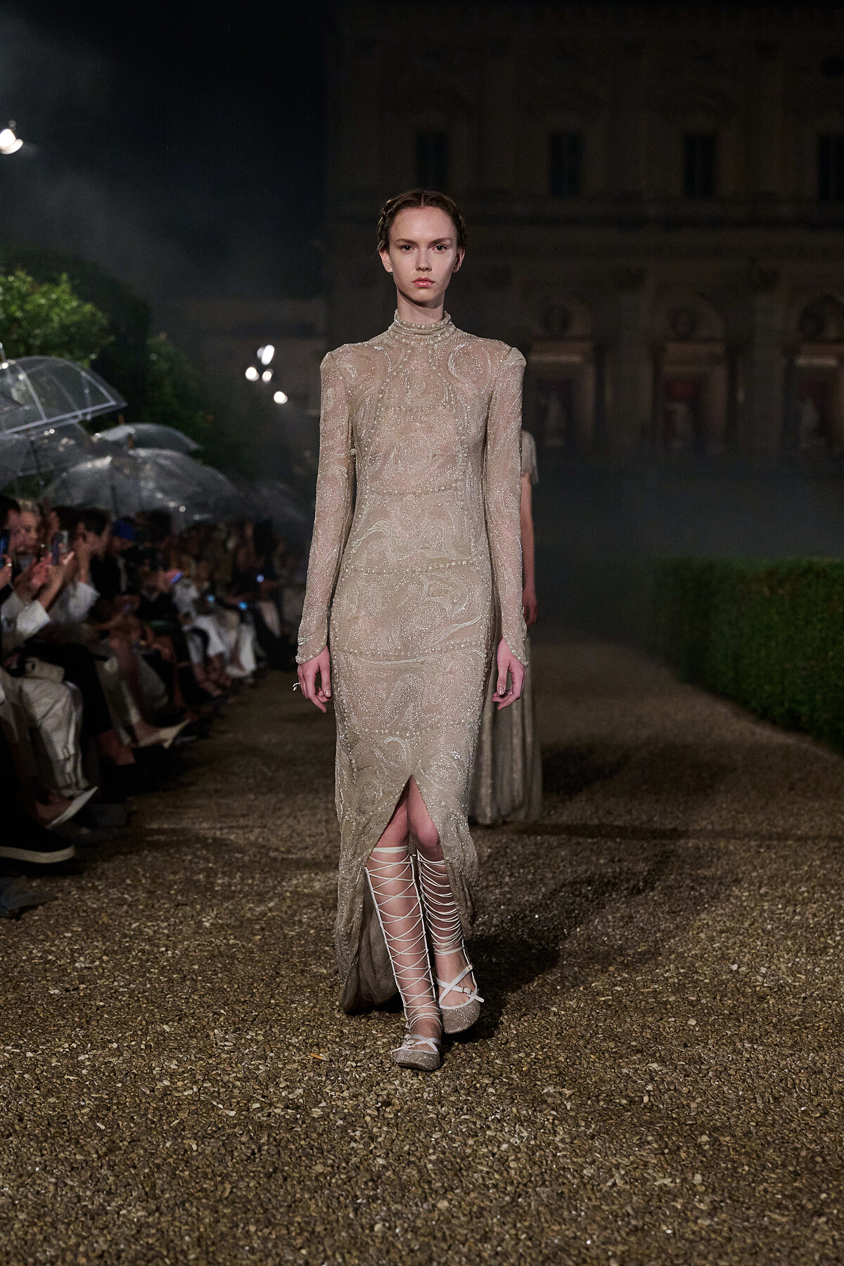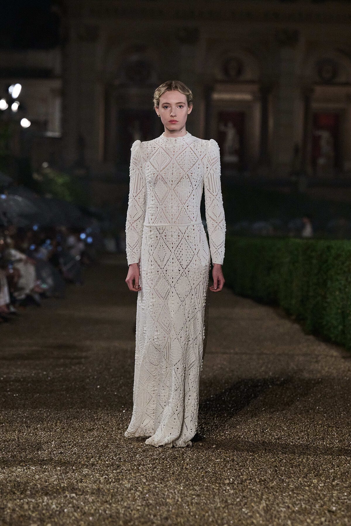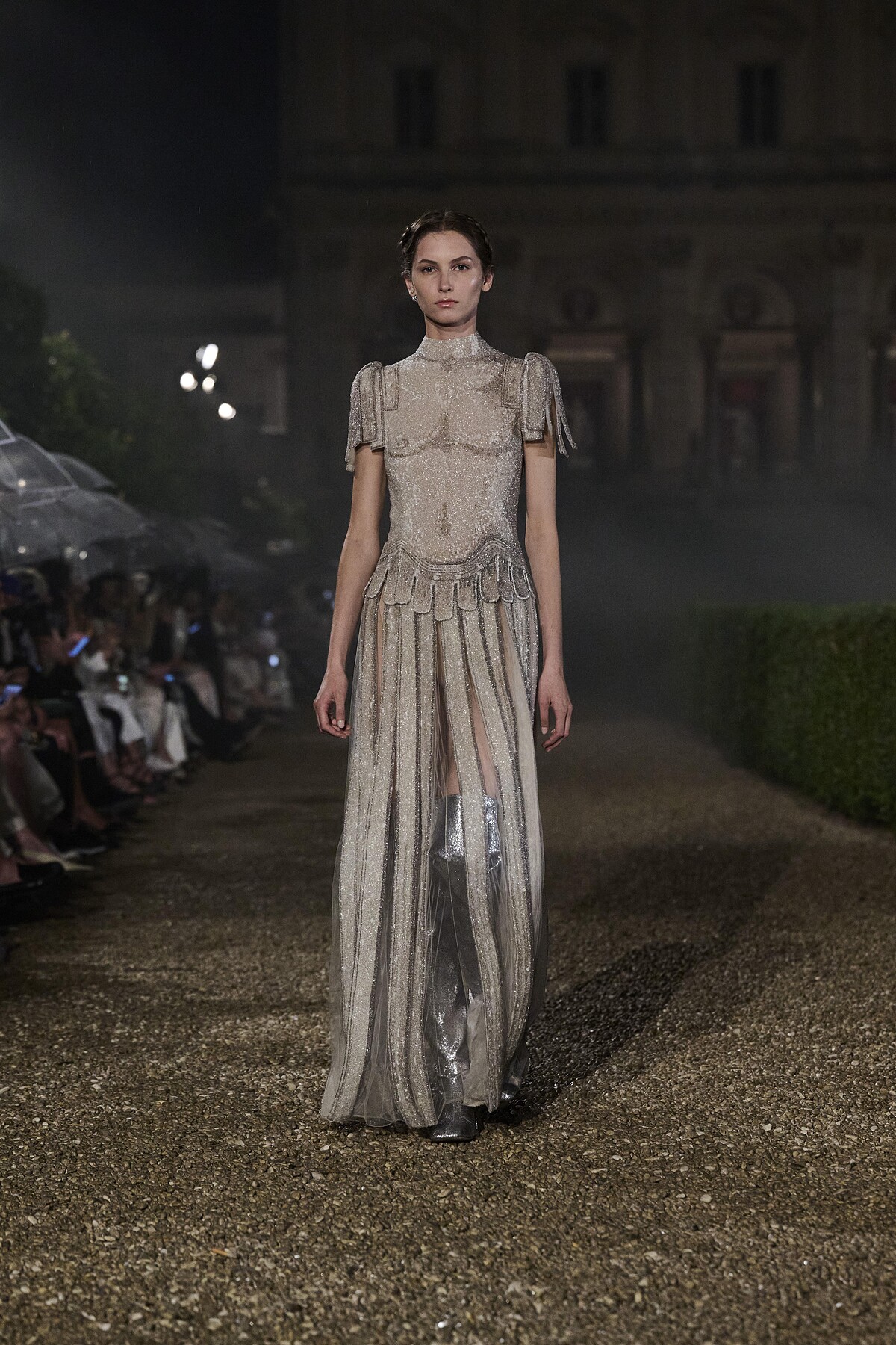 本季服裝系列將文藝復興與新浪潮兩大風格結合,從 中世紀的宮廷裝飾藝術到70年代的波西米亞風格,每件服裝皆透過面料、輪廓與紋理傳遞時間的交疊感。比如,光滑而閃耀的絲緞禮服上佈滿水鑽與刺繡,彷彿來自中世紀皇室的晚宴禮服,而肩部輪廓誇張而立體,結合70年代流行的 V 字形設計,營造出強烈視覺衝擊。
