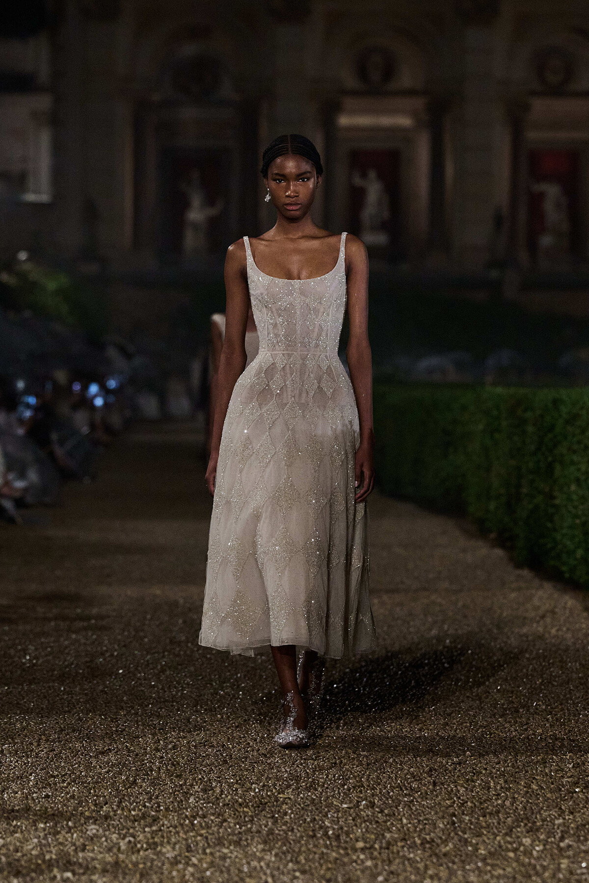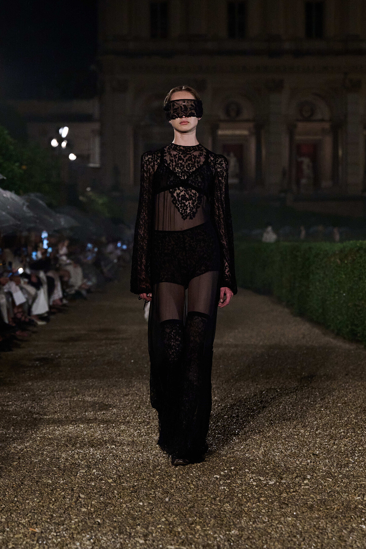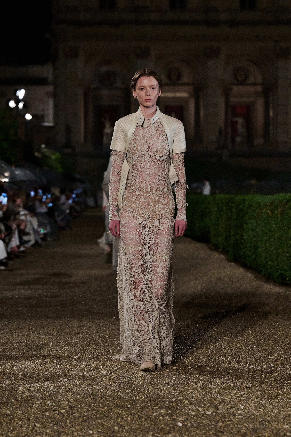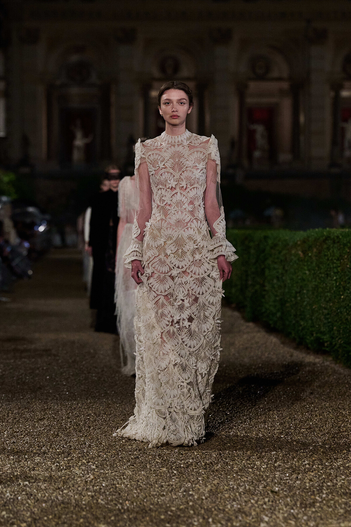 本季服裝系列將文藝復興與新浪潮兩大風格結合,從 中世紀的宮廷裝飾藝術到70年代的波西米亞風格,每件服裝皆透過面料、輪廓與紋理傳遞時間的交疊感。比如,光滑而閃耀的絲緞禮服上佈滿水鑽與刺繡,彷彿來自中世紀皇室的晚宴禮服,而肩部輪廓誇張而立體,結合70年代流行的 V 字形設計,營造出強烈視覺衝擊。