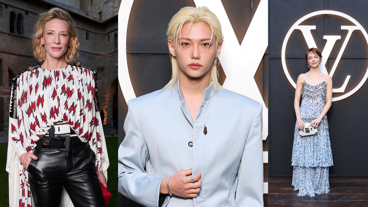 這場位於南法的早春大秀,當然也齊聚LV各國大使好友,凱特布蘭琪穿著米白色披肩與黑色皮革褲裝,像一個剛從一場法庭辯論走出的女祭司。他的髮絲微捲流露自然輪廓,而無須裝飾,而精靈王子Felix 身著灰藍斜紋羊毛大衣,剪裁近乎精算,每一寸的收邊像是為 Cour d’Honneur 的長軸線而生。還有鄭好娟、艾瑪史東等全球大使 —— 今晚,他們不是出席者,而是表演場域的一部分。