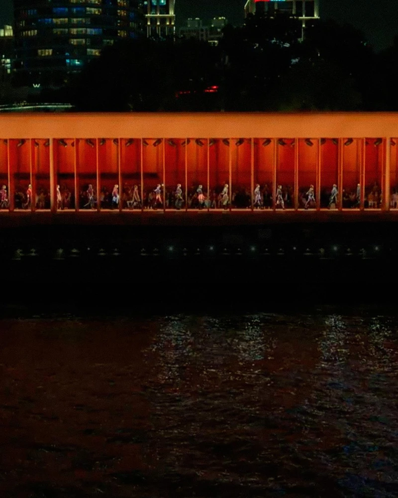 Hermès 大秀於選址於上海北外灘水岸邊舉辦,在這座模組化的建築中,可旋轉的牆面將空間將陸家嘴的天際線轉化為未來感十足的生命畫布,時裝與藝術交融,帶來傳統與創新的城市印象。