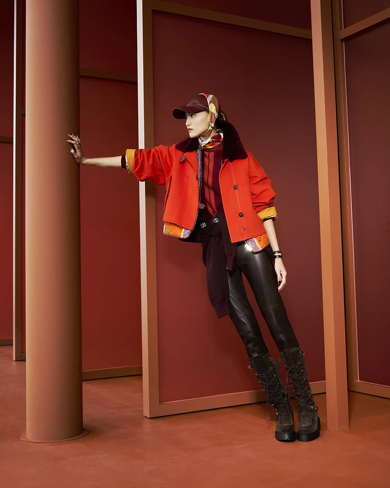 系列以實用輪廓與俐落個性貫穿系列,標誌性的編織元素跨越文化,將經典的 Dressage Tressage 絲巾上不對稱的圖騰賦予新生命,將經典元素透過功能、輪廓、色彩與印花的革新,進化延伸成連結現代及未來的嶄新面貌。