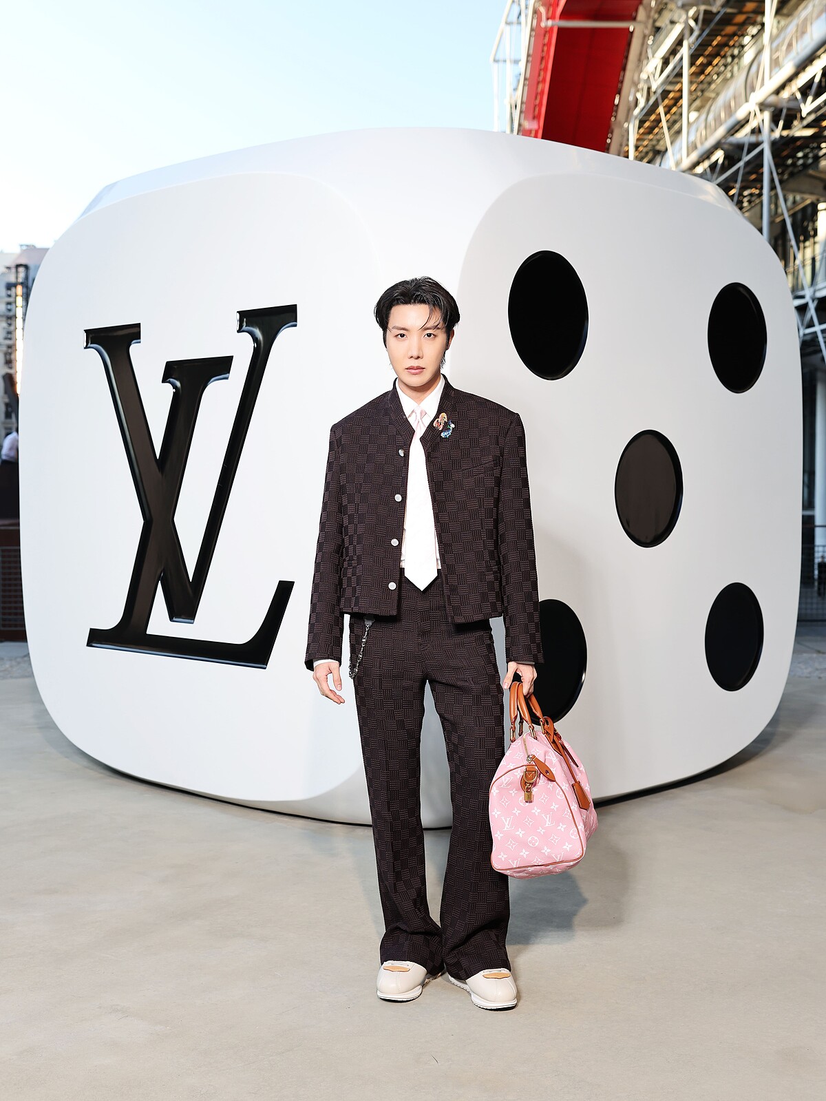 BTS J-hope 此次出席大秀以一身經典格紋套裝搭配全白色系襯衫與領帶展現時髦風範,手提的粉色旅行袋畫龍點睛,讓整體造型增添亮點,同時也多了分摩登趣味!