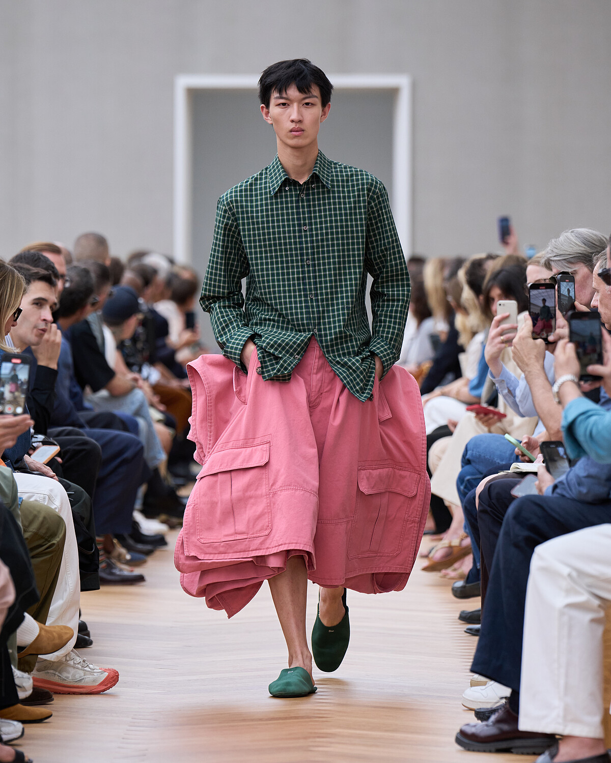 亦從服裝輪廓嗅出了十八世紀宮廷剪裁的氣息,優雅的馬甲在 Model 身上展現一絲細膩優雅的性感,經典 Bar Jacket 混搭極寬鬆的工裝七分褲,花朵、刺繡與格紋也帶出英式韻味點綴其中。此外,極富童心的結構式設計,像是領帶反面標籤外露、可拆式領結等,這些「玩法」都讓人一眼就看出:這就是 Jonathan Anderson!