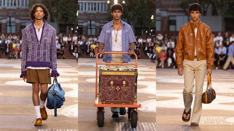 Louis Vuitton 2026 春夏男裝秀選在龐畢度中心登場,一開場就像走進一盤放大版的蛇梯棋——這場秀不只是視覺盛宴,更像是一趟文化旅程。男裝創意總監Pharrell Williams 以印度為靈感出發,從布料、色彩到配件設計都充滿感官細節,紫色取代黑色、咖啡色丹寧變成新主角,Speedy包、登山靴到柔軟皮革的運動鞋,都是「陽光曬過後」的褪色感,帶著一種時間走過的痕跡。由路易威登為 2007年的電影《大吉嶺有限公司 The Darjeeling Limited》創作的圖案也首次被加入男裝系列設計中,透過刺繡和印花在服裝和配飾上呈現,Pharrell 把街頭、傳統、旅行與奢華揉合在一起,做出一場很有他味道、也很LV的秀。