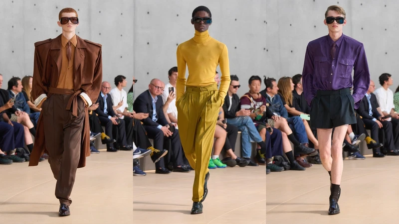 男裝大秀多次在官方日程之外舉行的Saint Laurent,在創意總監Anthony Vaccarello帶令下正式回歸官方排程中,本季選在巴黎商品交易所舉行,Anthony Vaccarello捨棄以往的夜色氛圍,選擇以午後光影貫穿秀場,讓輪廓與情緒自然顯影,這一季不講張揚、不強調態度,而是把焦點放回衣服與身體之間,收腰西裝、寬肩線條,搭配輕盈的絲綢與尼龍材質,在走動間若有似無地透露輪廓,色調有別於過去的節制感,以沙色、枯苔綠、池藍、粉紅、亮黃詮釋的One Tone造型,有著優雅的明亮彩度。