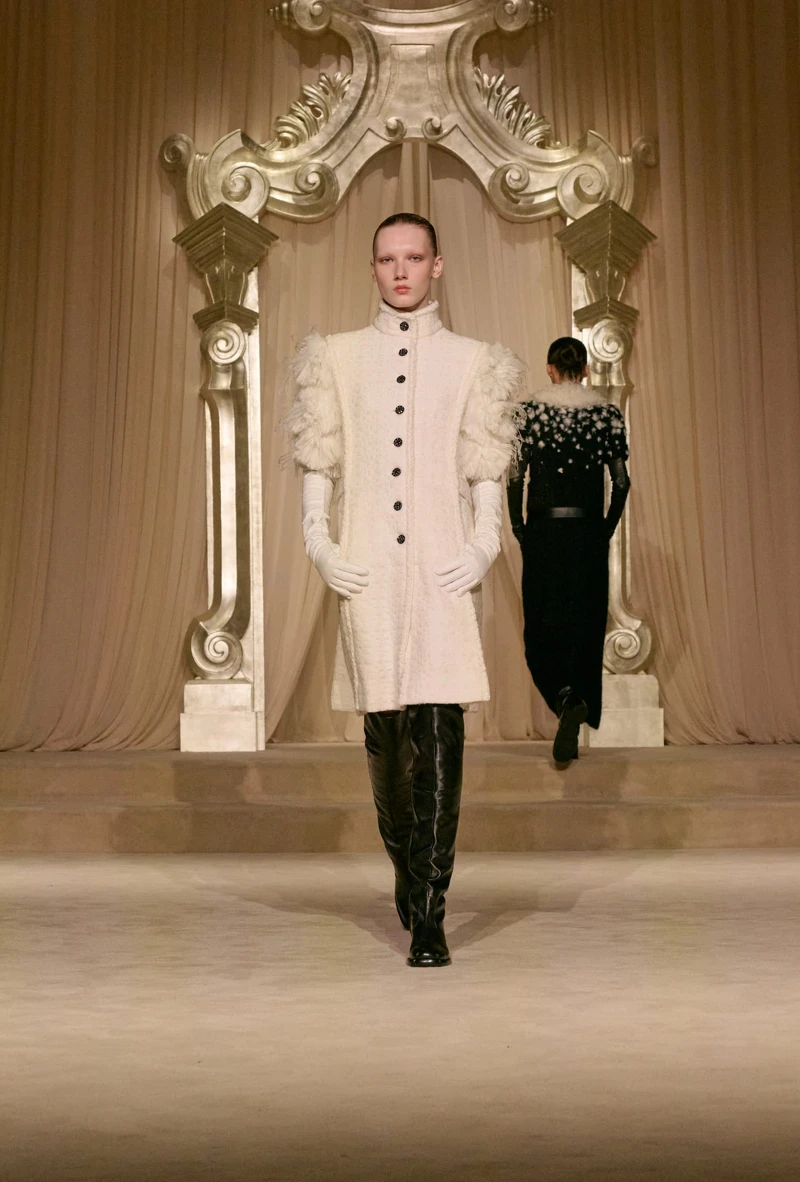香奈兒本季同樣於大皇宮榮譽廳(Salon d’Honneur)發表全新秋冬高級訂製服系列,一場讓人靜心的服裝詩作,由Willo Perron打造的秀場空間特別重現康朋街31號的高級訂製沙龍意象——米色牆面、鏡面旋梯與溫柔光影,為這場回歸自然的旅程鋪陳出一個靜雅的全新預告。