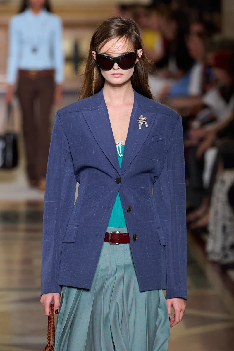 像是偷翻父親的衣櫃,Tory Burch從中取了幾件帶有比較美式休閒且傳統記憶中屬於較為男性的的單品變得優雅又現代,呈現在2026春夏系列之中,像是維持Polo衫的男版尺寸,搭上低腰皮裙混出不一樣的穿搭想法;又或者是像西裝外套的挪用,肩線維持男版的寬度,中間抓出收腰細節、呈現漏斗型輪廓,帶出曲線之姿。