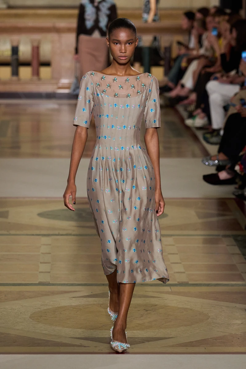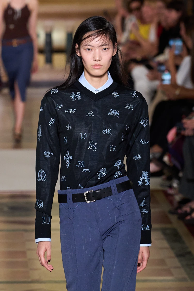 Tory Burch 2026春夏系列之中也放了不少精力在工藝上,尤其是面料的處理與刺繡細節,例如針織衫上的西洋風格的家徽圖樣,每個字母繡的是參與本季設計的每一個成員;又例如真絲雪紡的洋裝,亦是用手工打褶的方式所打造的。