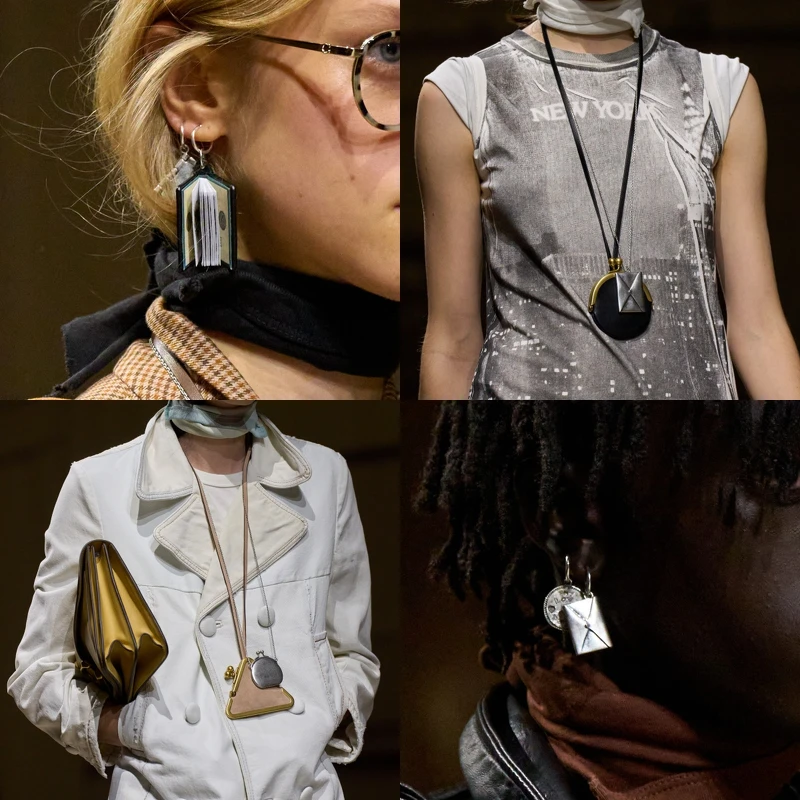 另外,頸間與耳尖也有許多吸睛小物——書本與信封造型耳環、信封形狀的墜飾疊搭迷你口金包等,翻玩配件之間的搭配可能。