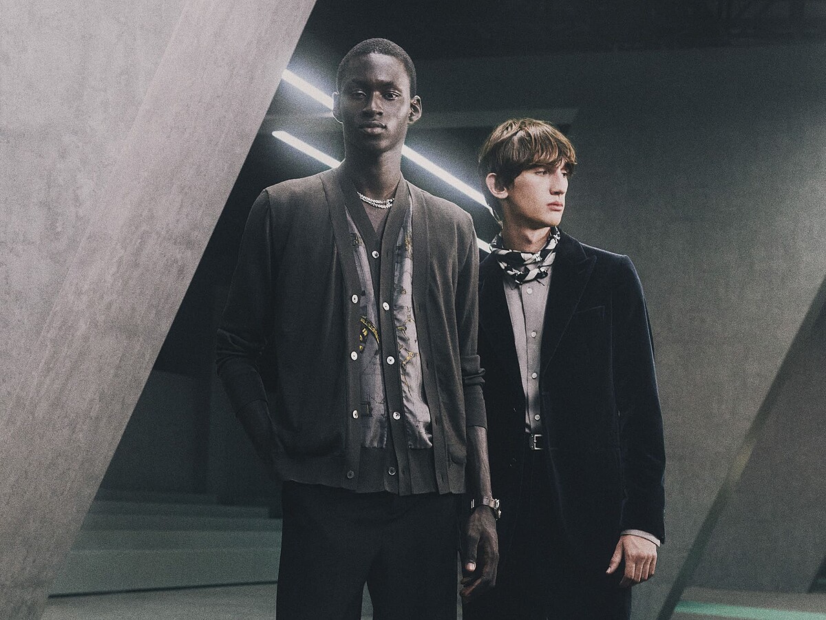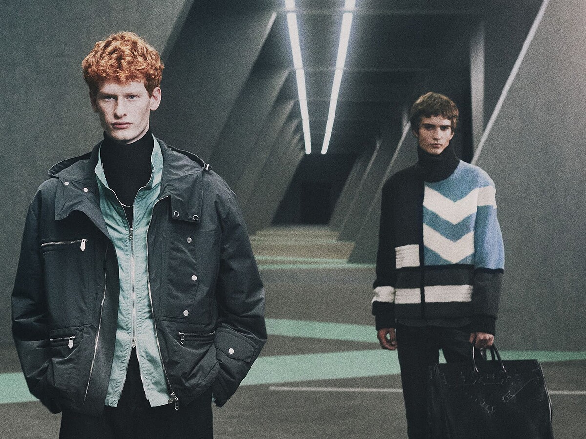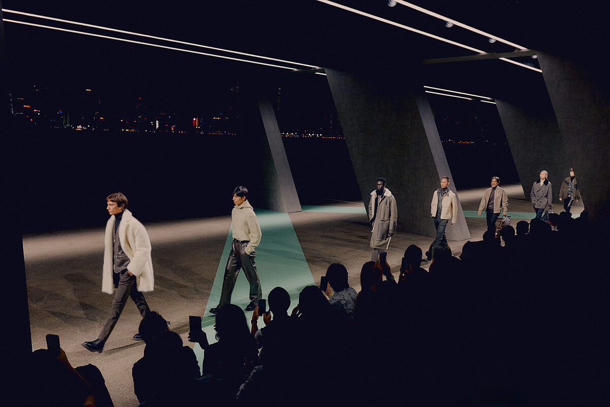 毛毯質感的派克大衣則散發著溫暖氣息,將幾何化的馬術圖騰於布面展開,將現代男士風格延伸出一種介於經典與前衛之間的視覺張力。這場材質對話不僅在服裝中展開,也滲透進秀場,讓服裝與建築彼此映照,達成完整豐富且深具層次的沉浸式體驗。