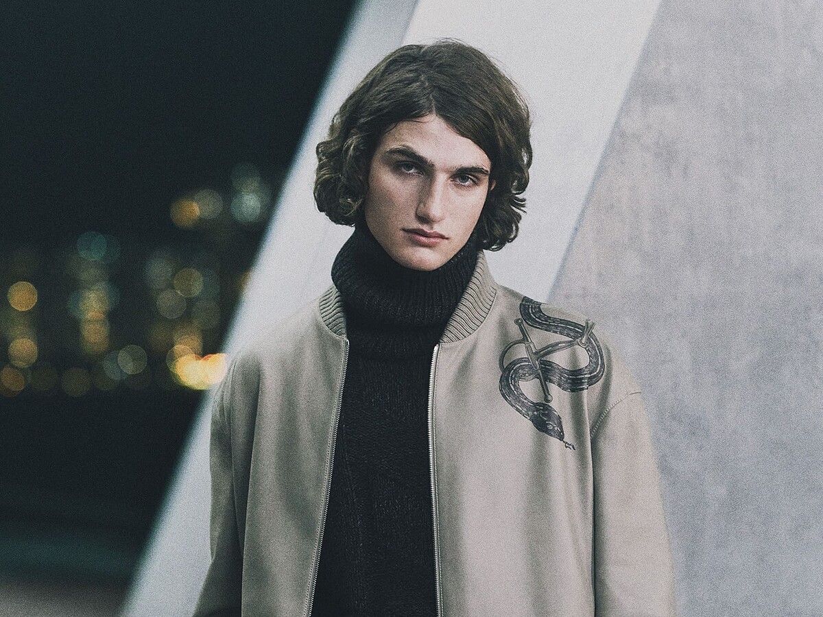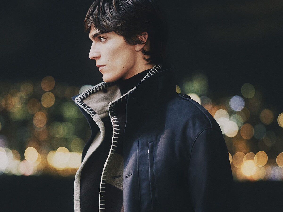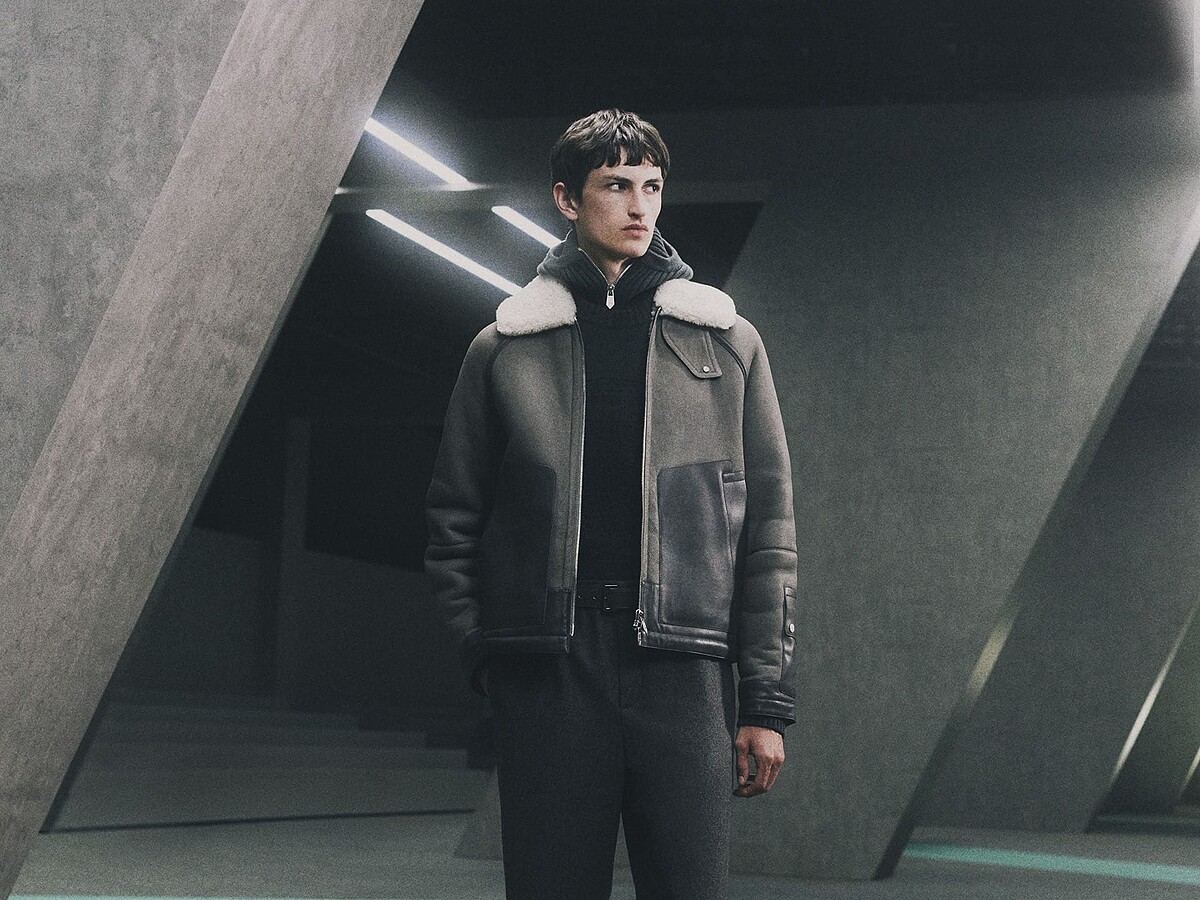 毛毯質感的派克大衣則散發著溫暖氣息,將幾何化的馬術圖騰於布面展開,將現代男士風格延伸出一種介於經典與前衛之間的視覺張力。這場材質對話不僅在服裝中展開,也滲透進秀場,讓服裝與建築彼此映照,達成完整豐富且深具層次的沉浸式體驗。