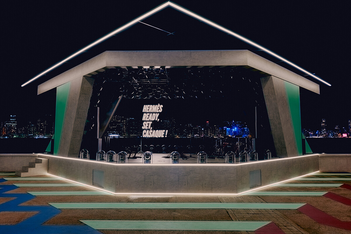 秀後,隨著燈光投射於斜線軌跡下,宛如城市的節奏脈動在耳語間傳來,摩登時髦的節拍讓人置身於一場神秘且令人著迷的愛馬仕風格遊戲之中。