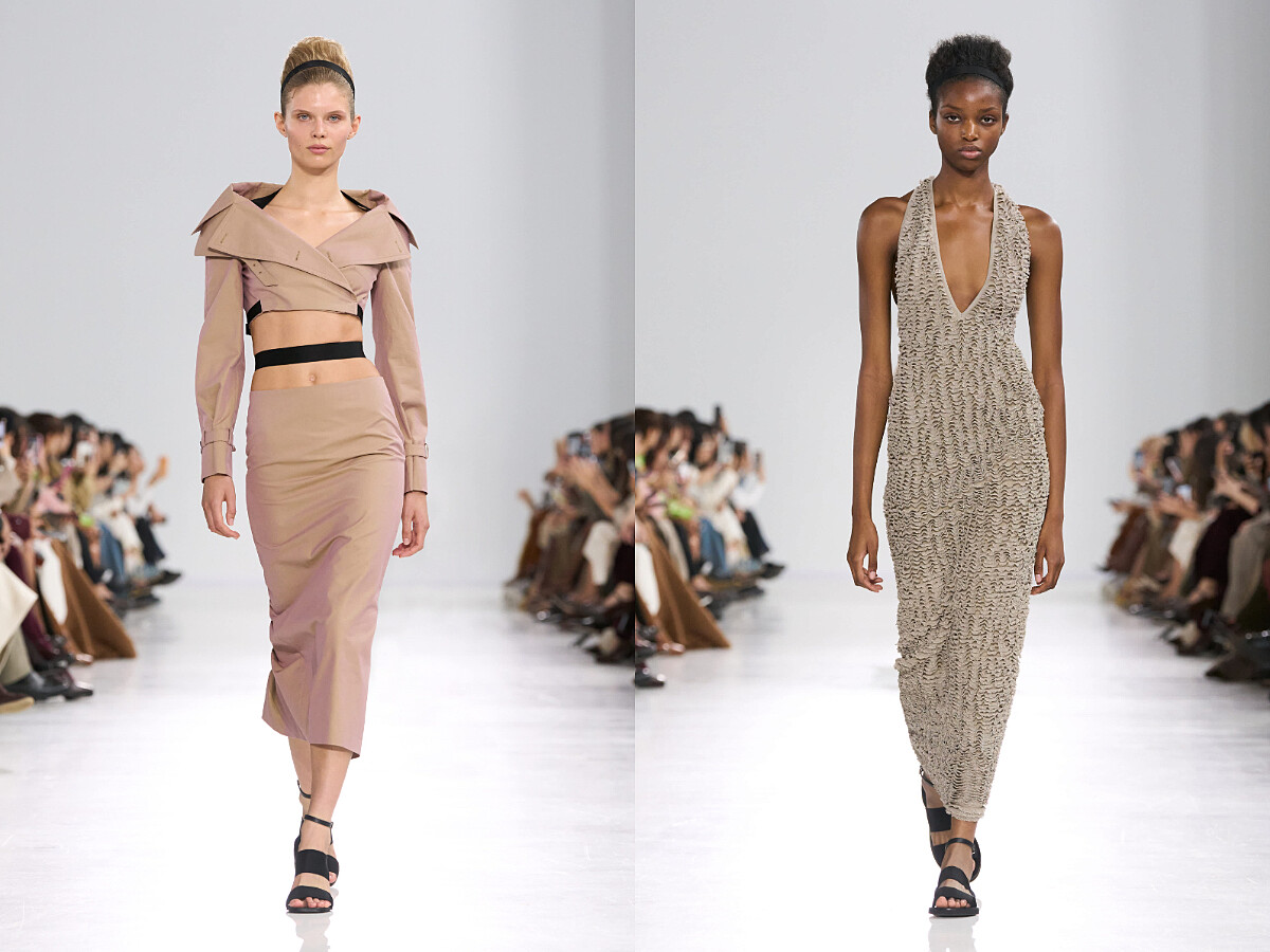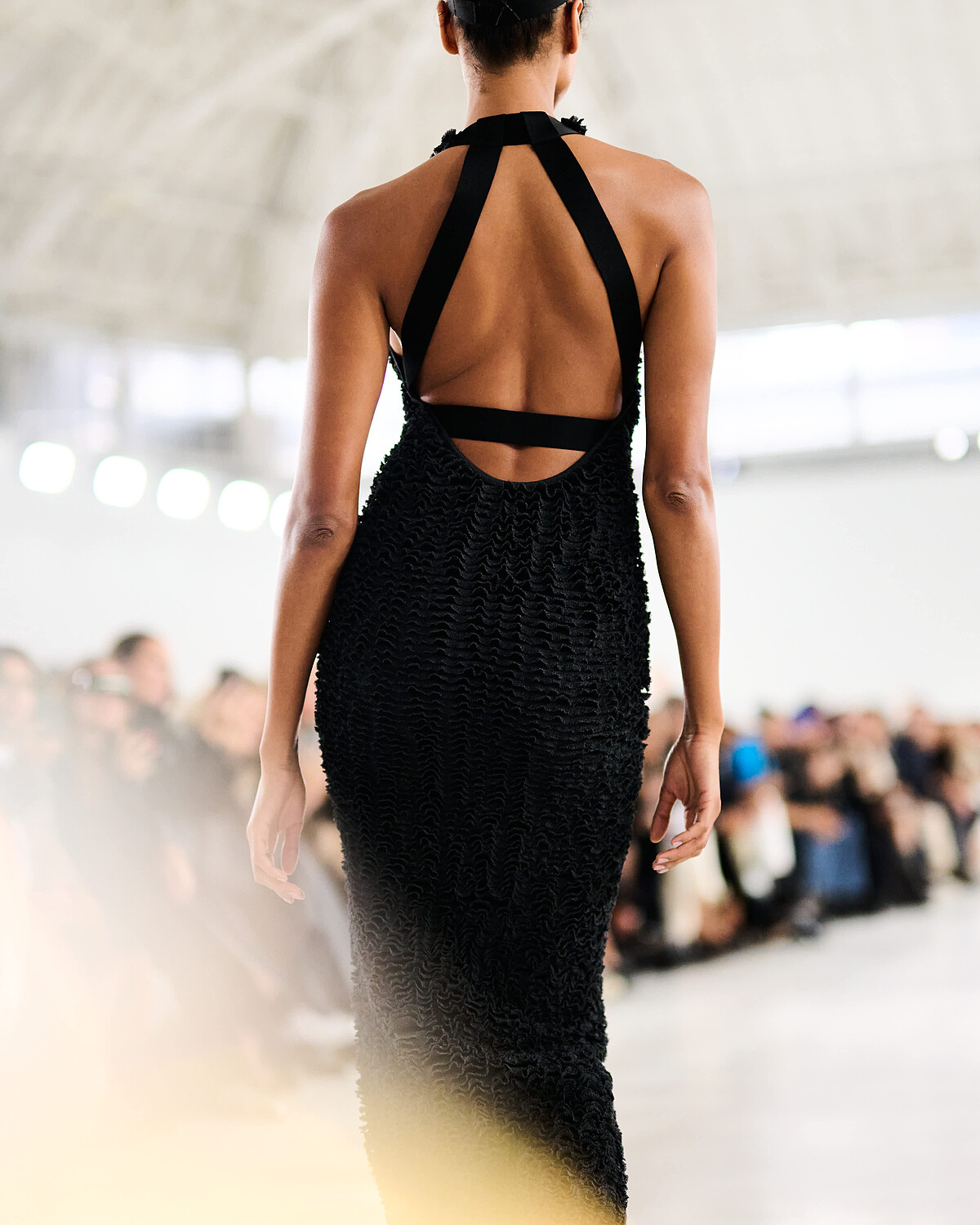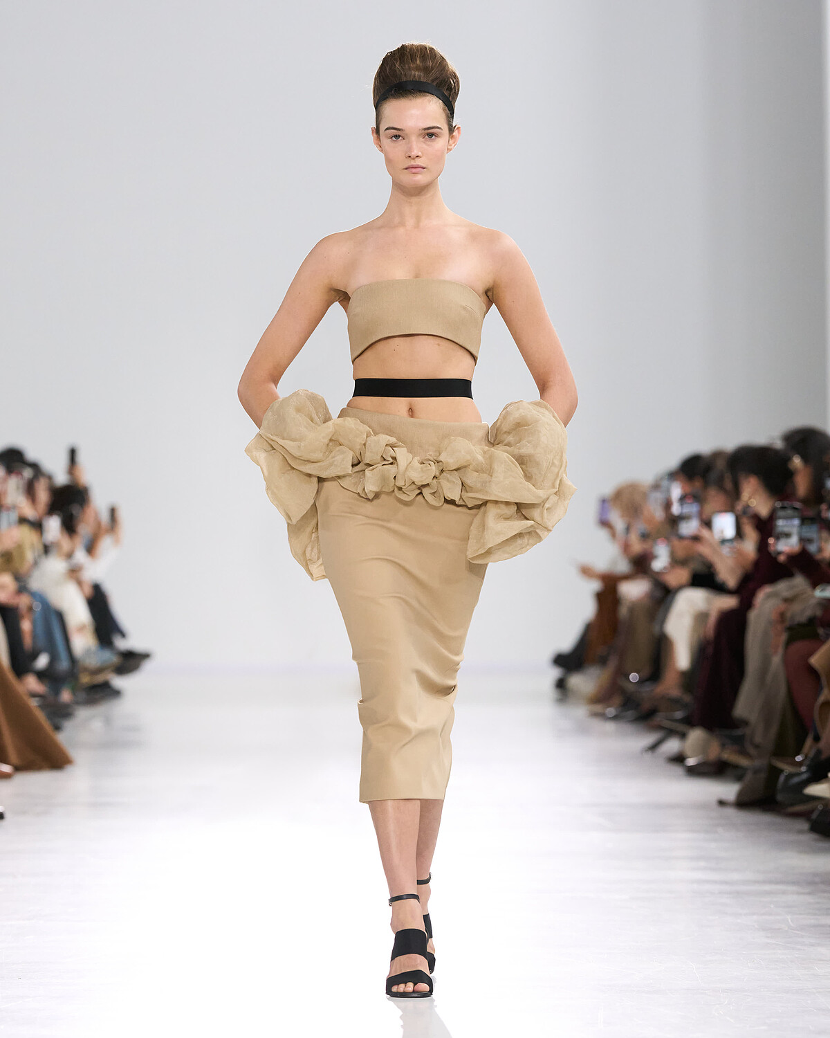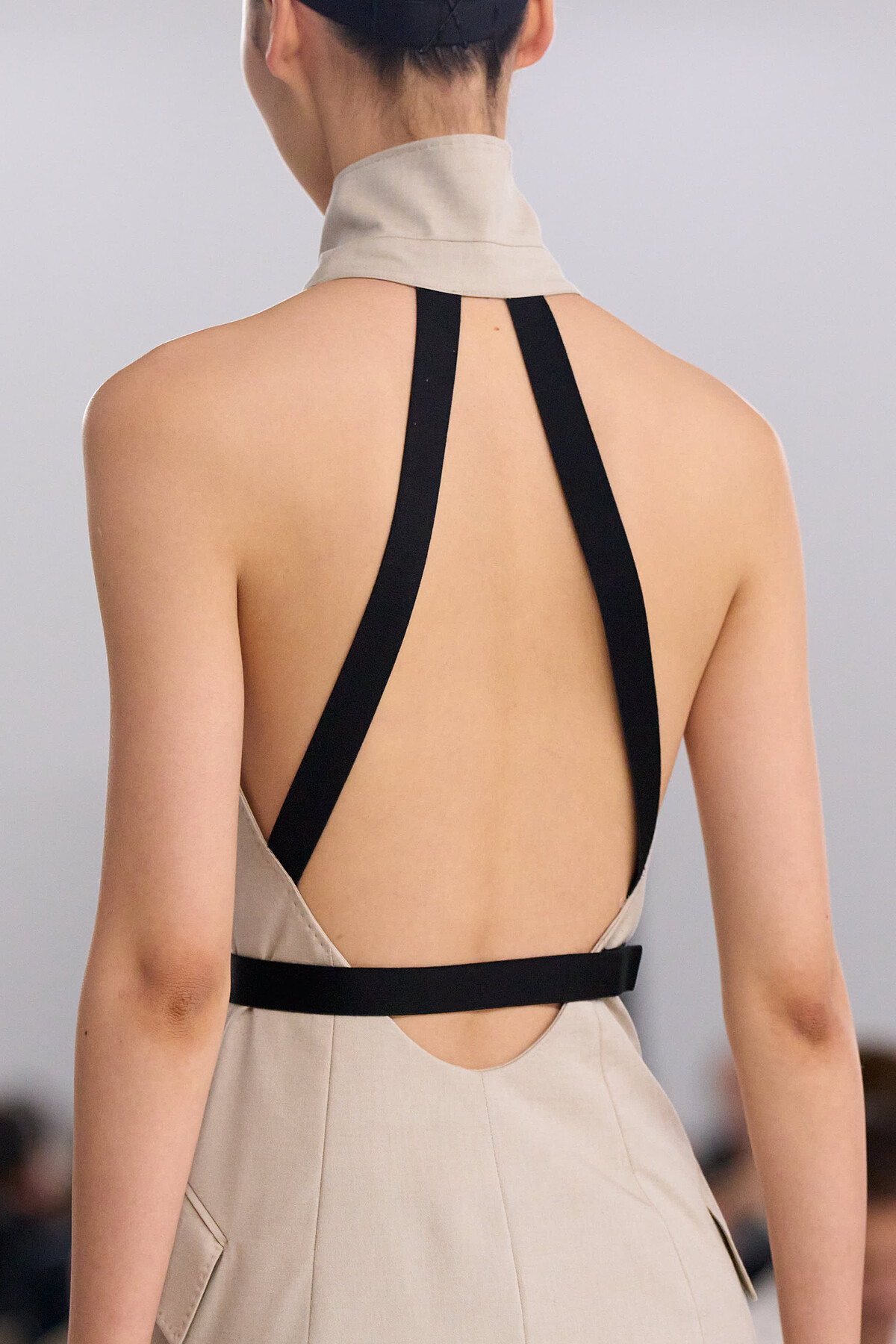 Max Mara 2026春夏系列由「黑色彈力帶」給貫穿,多套優雅造型中皆被加入了黑色彈力帶、彈性腰封的元素,成為支撐全新剪裁的關鍵一步,纏繞腰間、背部、頸部的方式,其實是從馬具裝束為靈感延伸而來,不只呼應洛可可的輕鬆態度、注入一抹運動氛圍,更使裸露肌膚的部位增添優雅修飾的效果。