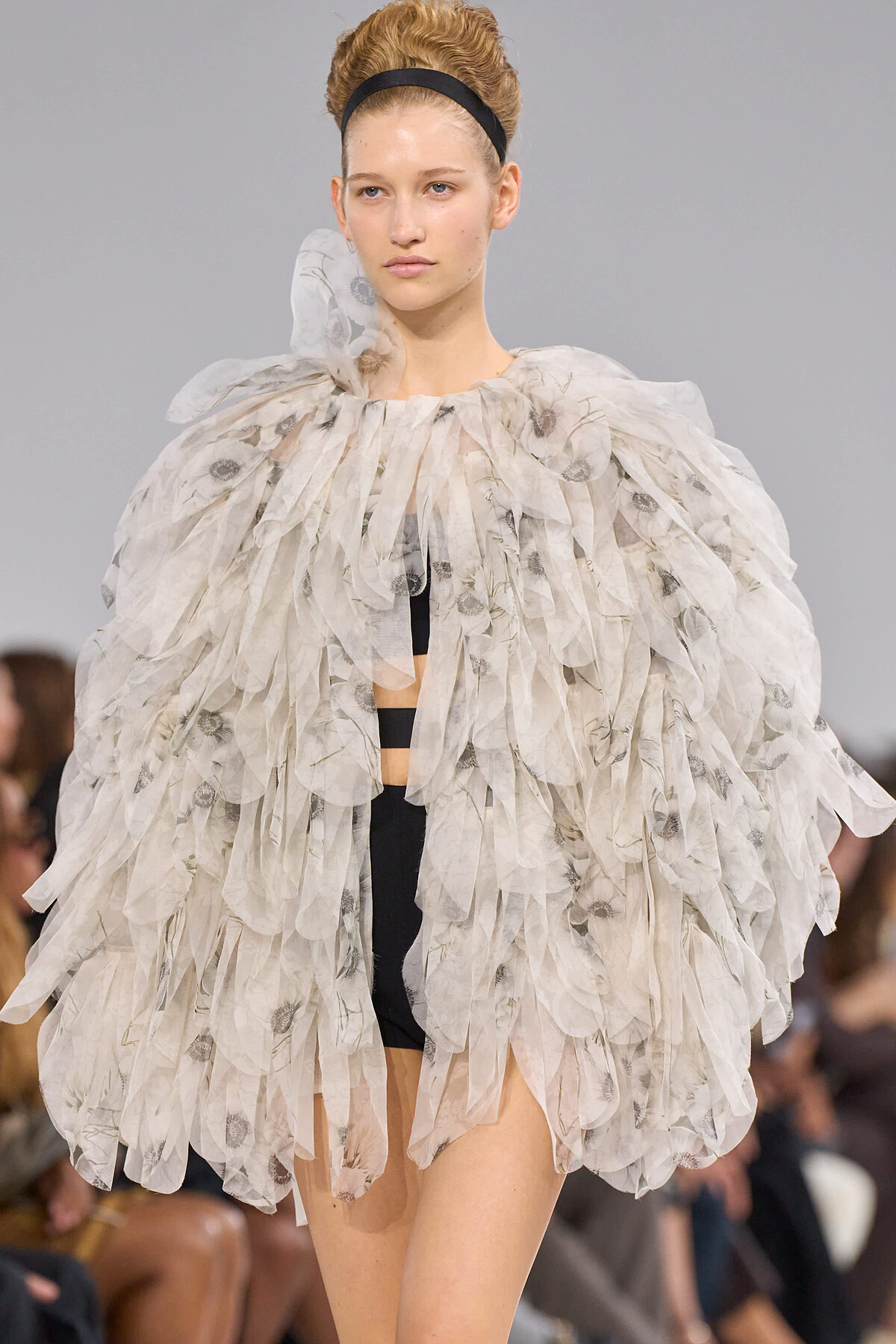 本季Looks當中,蓬鬆飄逸的澎紗迷你裙令人印象深刻,原來它是由千層印上圖騰的片狀歐根紗布料手工縫製而成,隨著行走使仙氣流動,運用在外套上頭則營造出像羽毛一般豐厚的感受,但實際上卻是非常的輕盈!細看圖騰中還能發現海洋、陸地生物的身影,有讓人陷入奇幻氛圍的魔力。